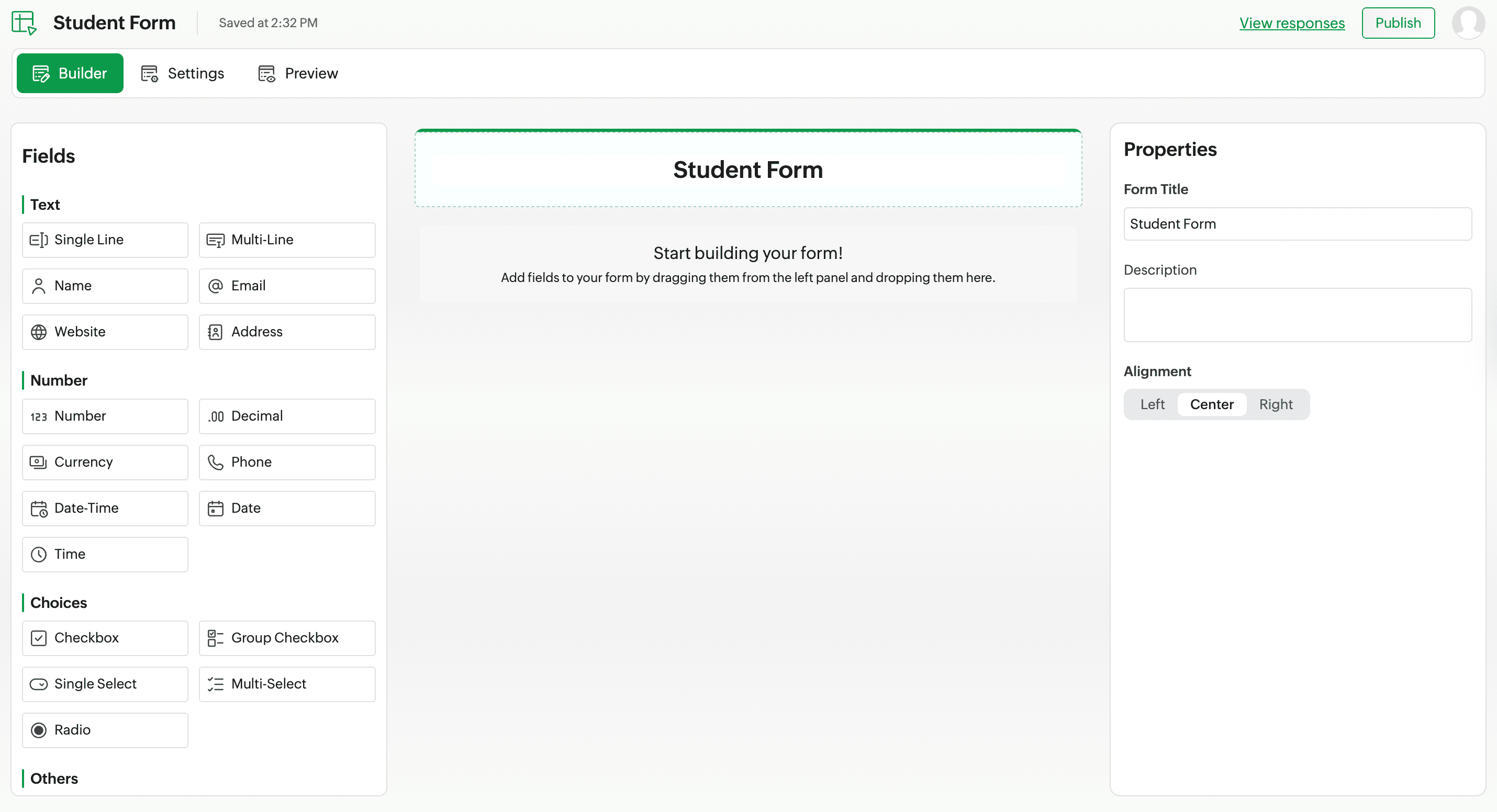 Drag required fields from the left panel and drop into the form builder frame. Edit each field with field properties that are displayed in the right panel.
