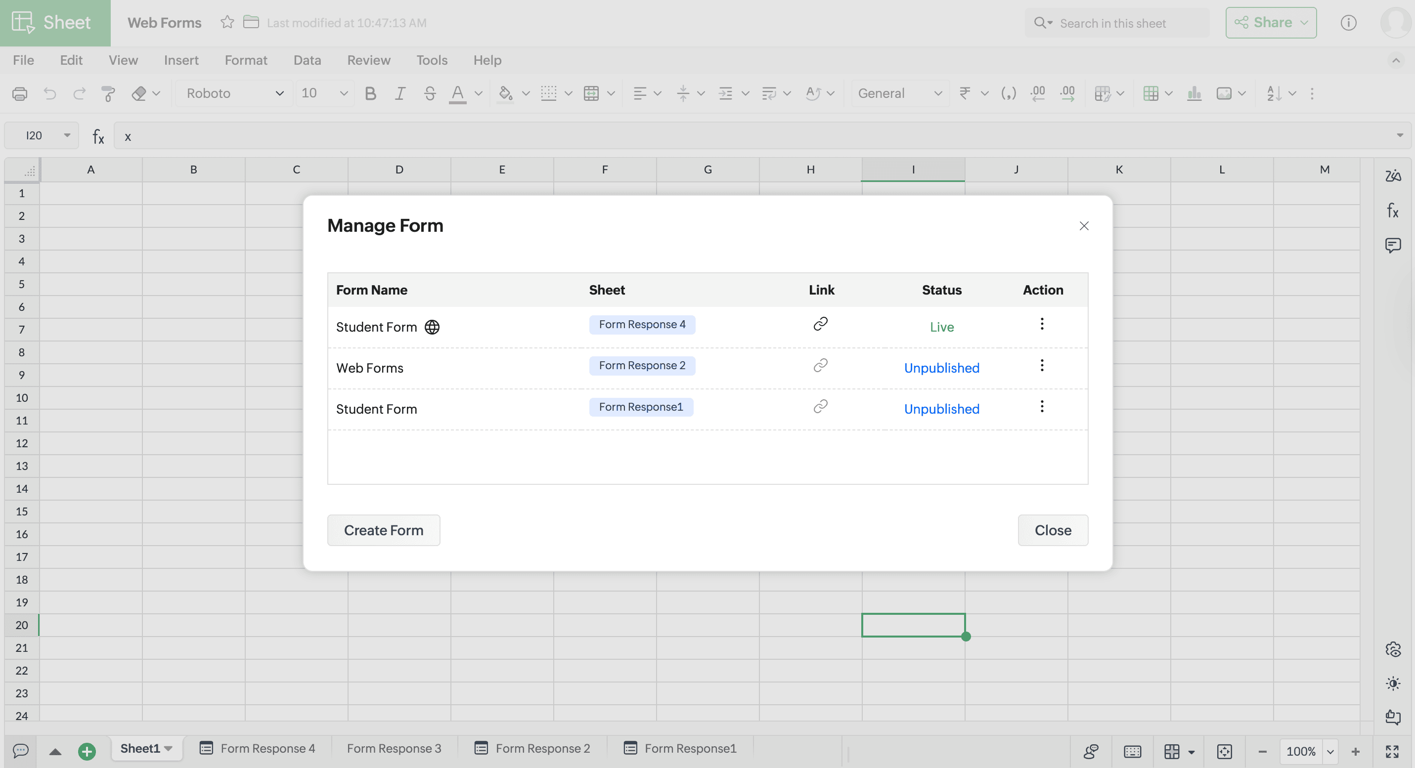 You can find the details of the forms with access to view, edit, and delete from the manage form window. You can also access the link to share the Web Form.