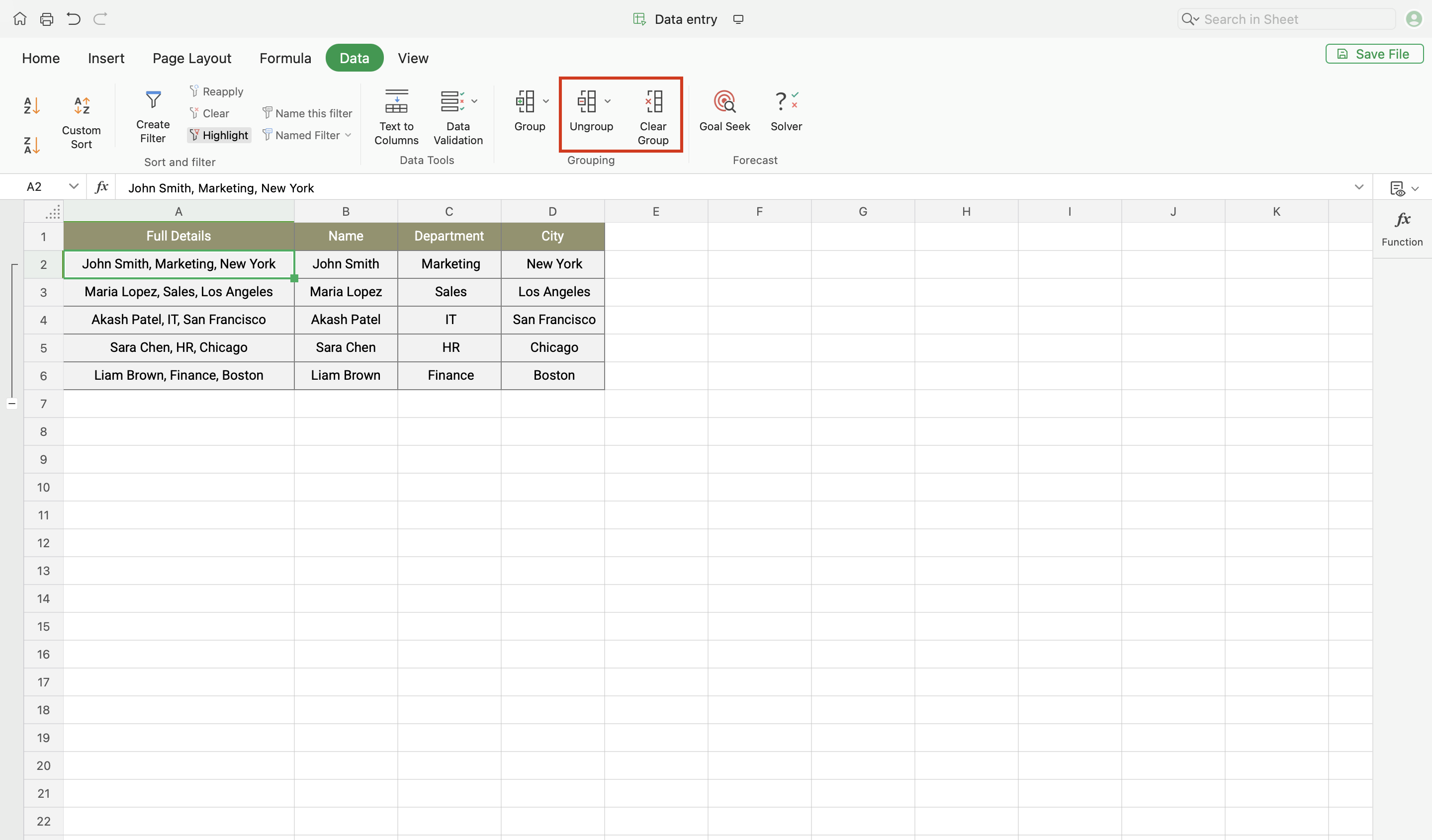 - Go to Data > Ungroup