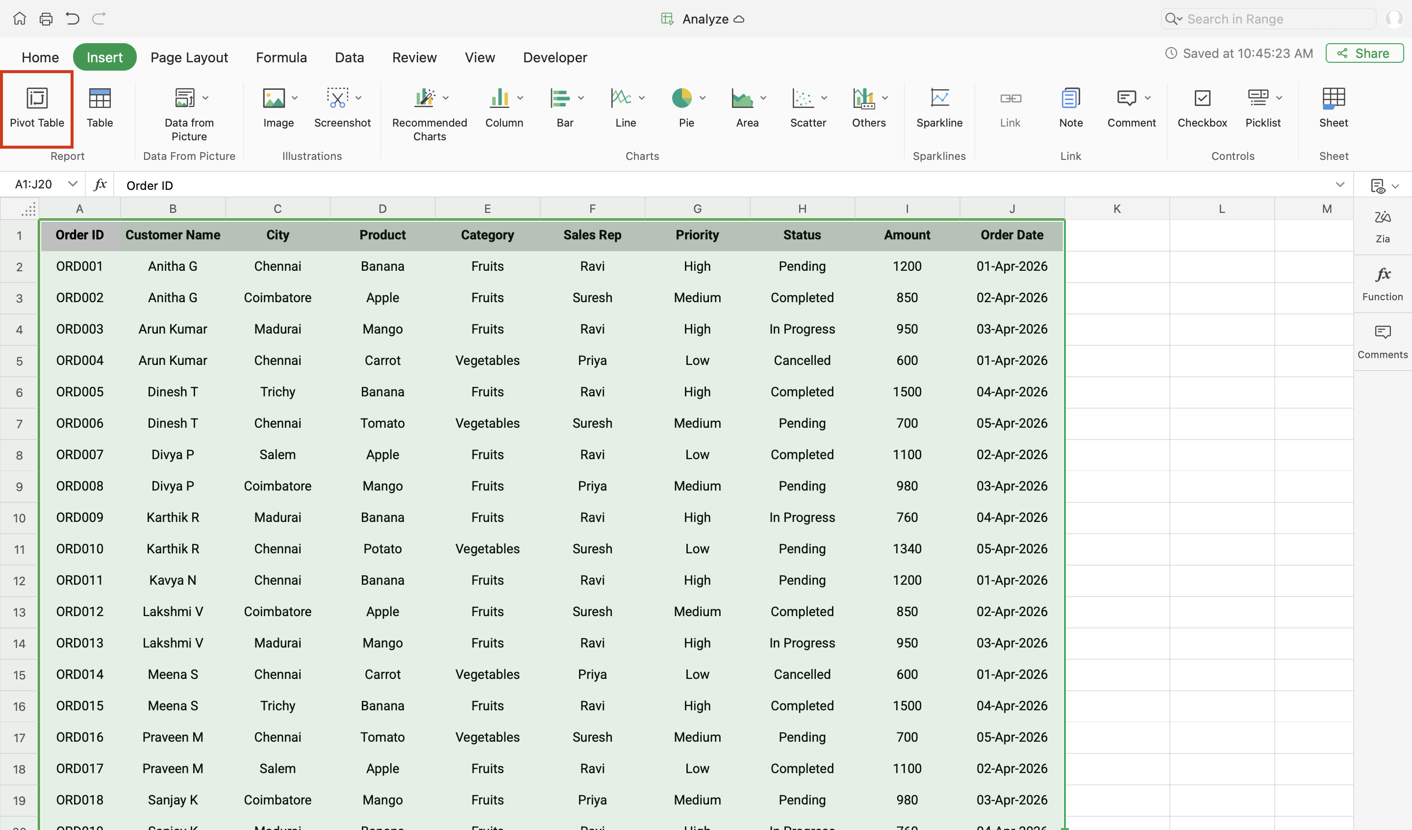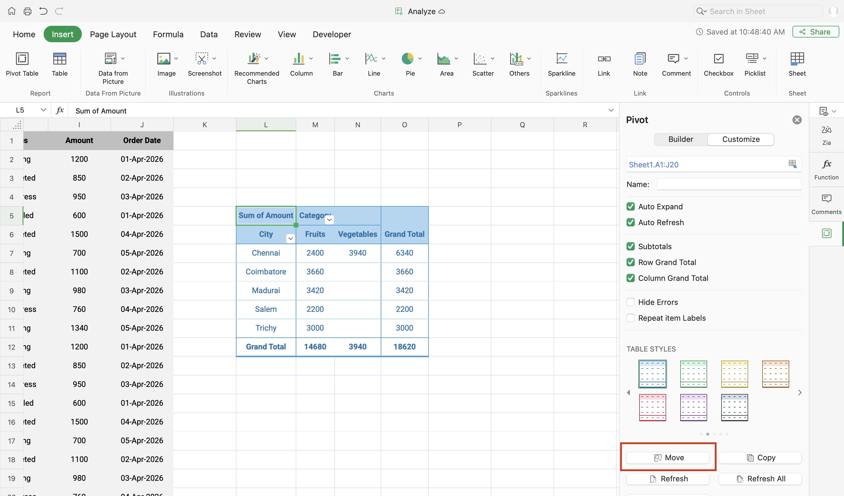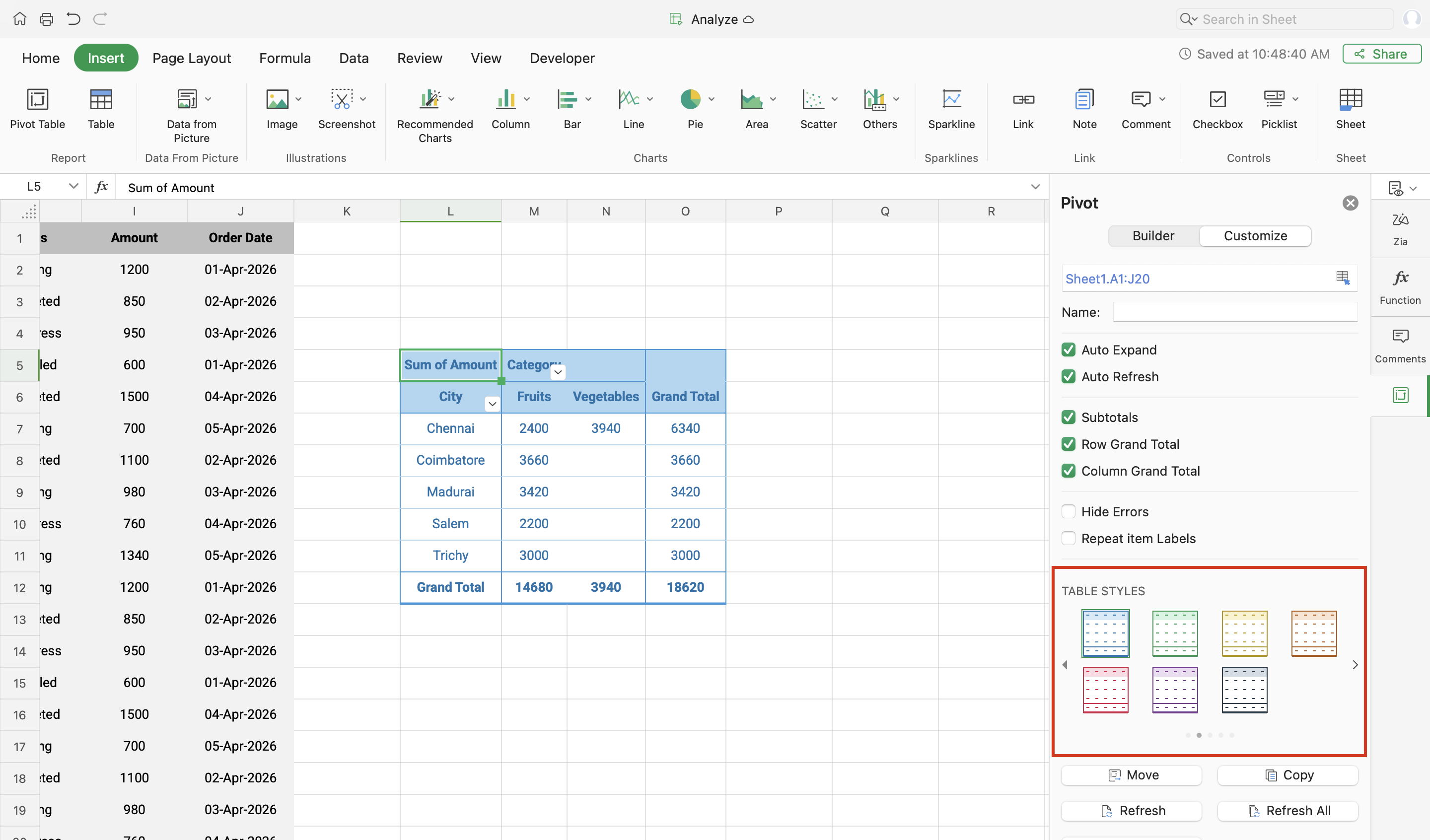 - Alternatively, select the pivot table you wish to edit, and click the Pivot icon on the side pane and edit the table.