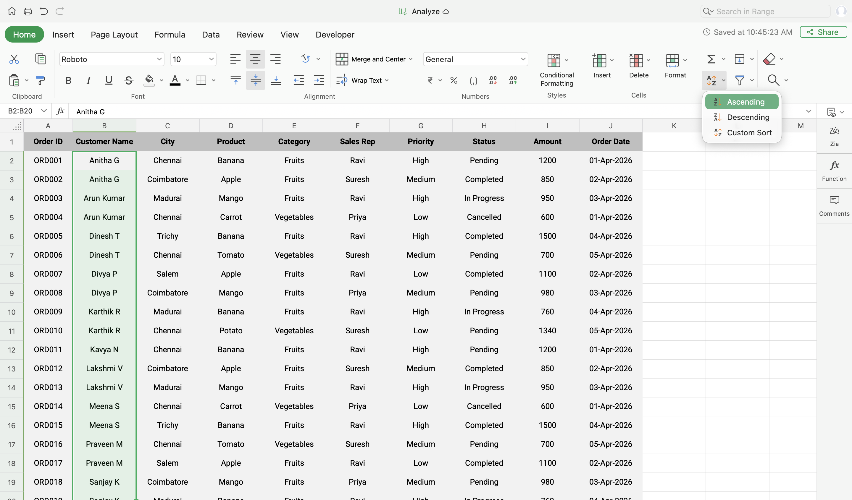1. In the Data menu, select to sort in the Ascending and to sort Descending.
