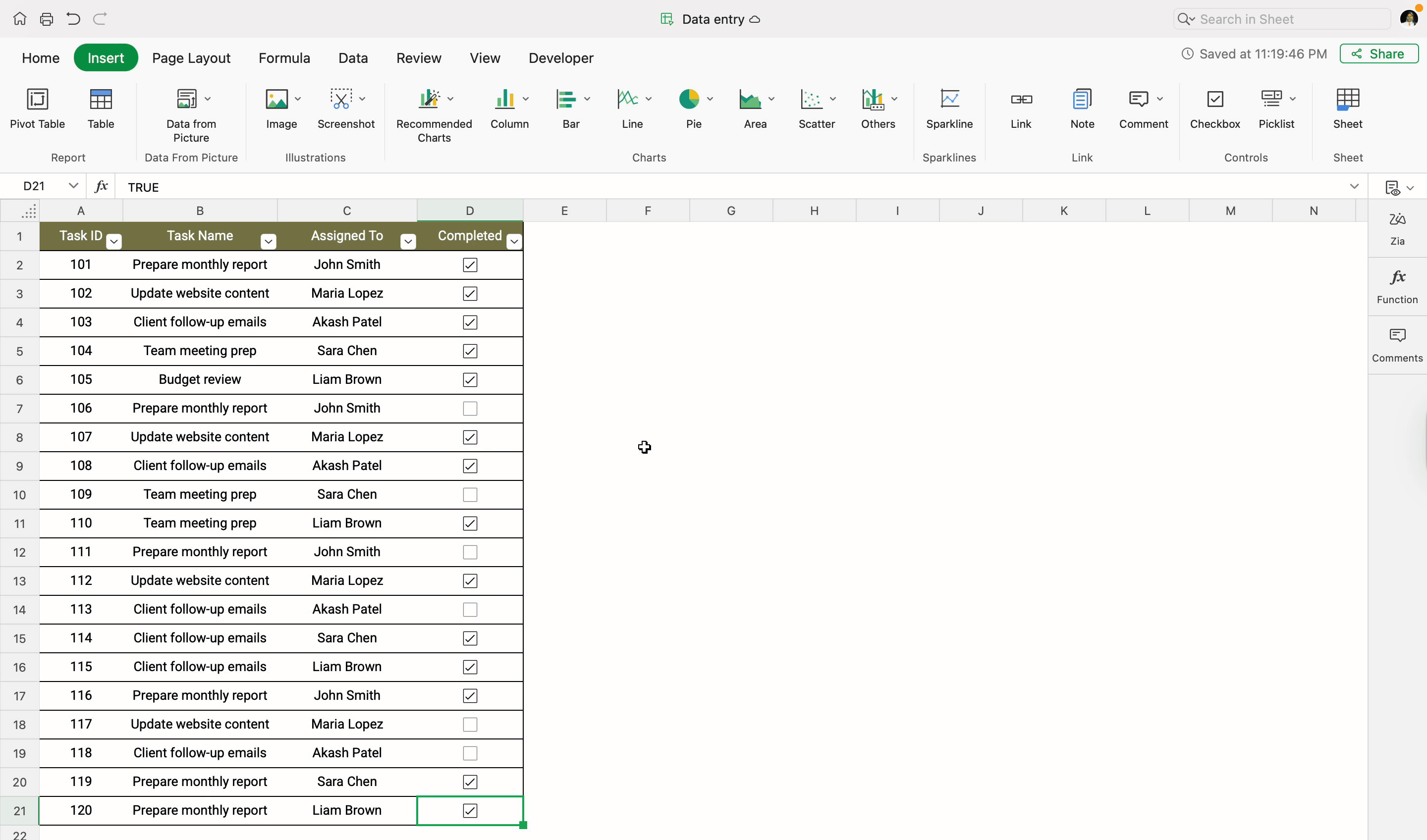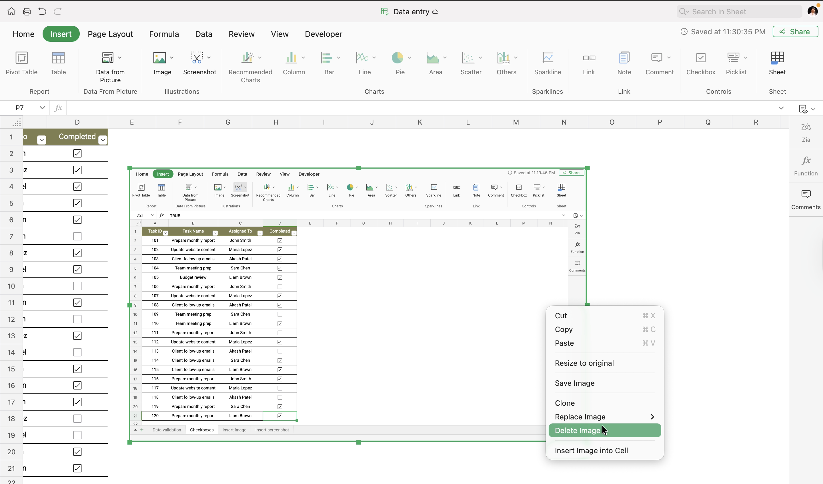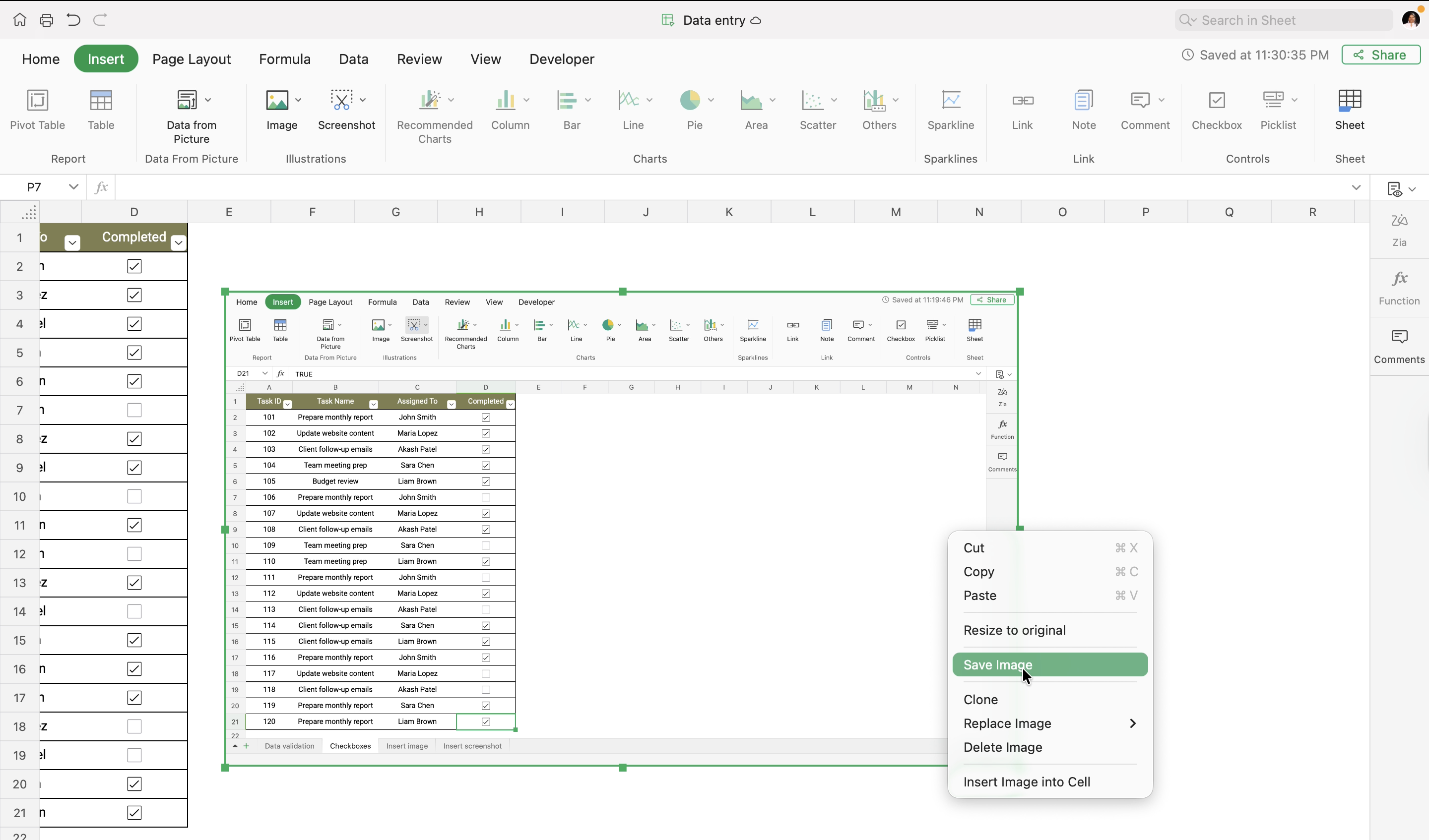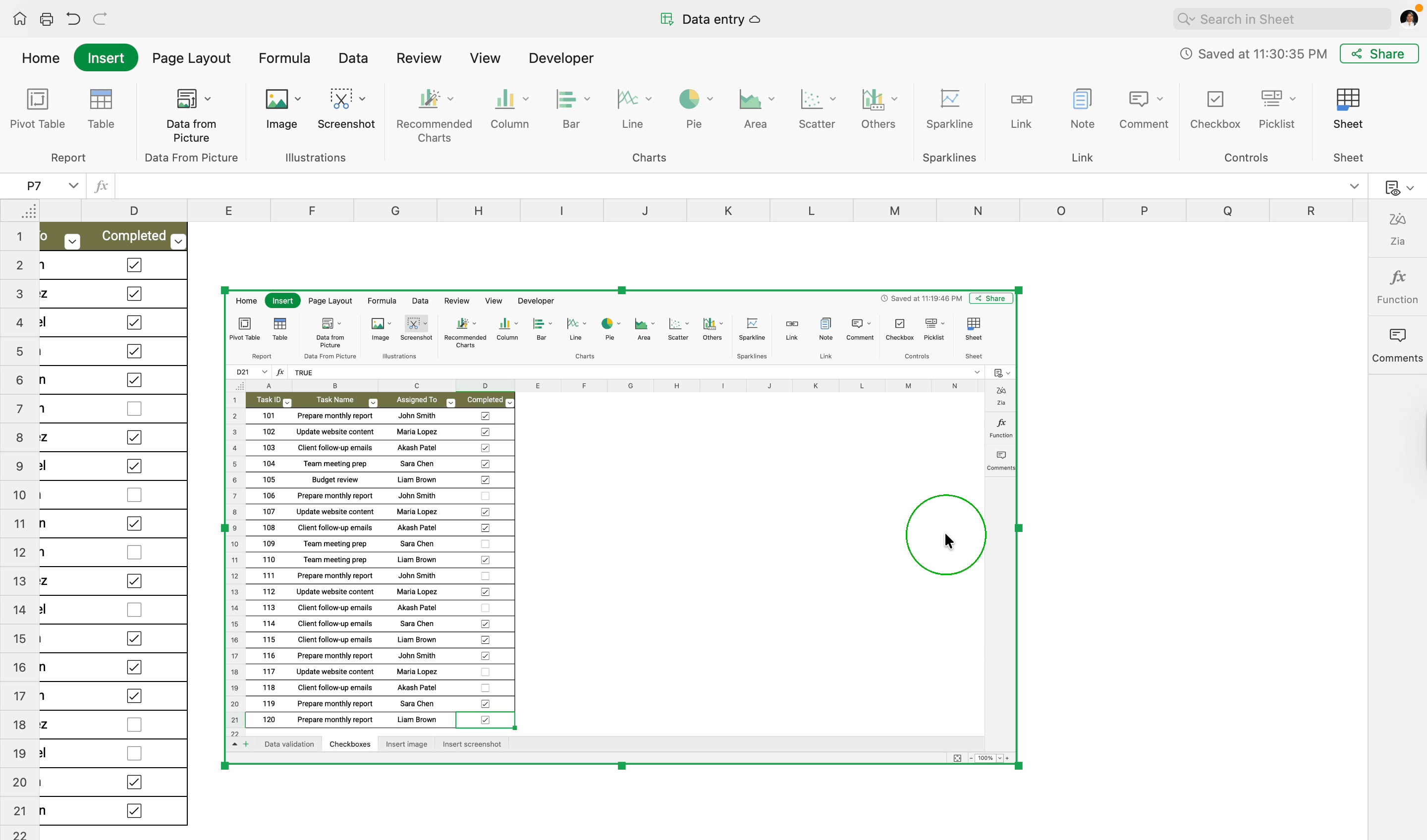 - To insert screenshots of a portion in your spreadsheet, select Screen Clipping and capture the image.