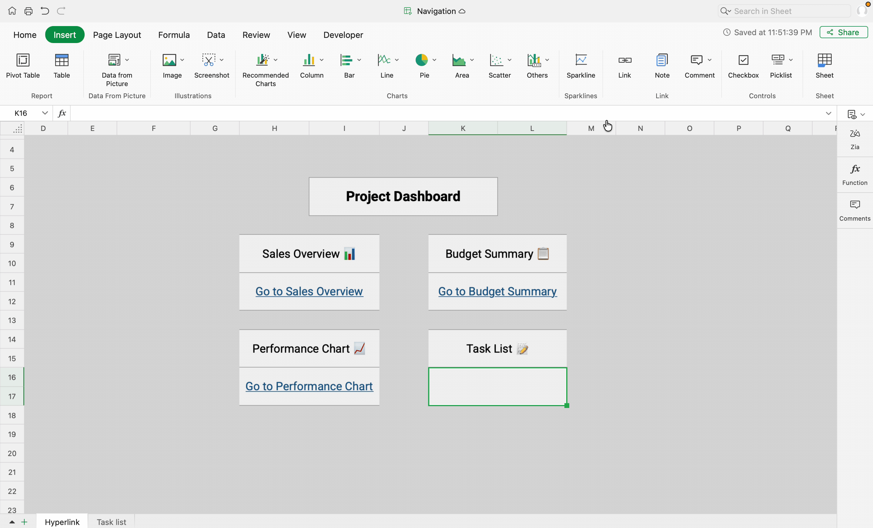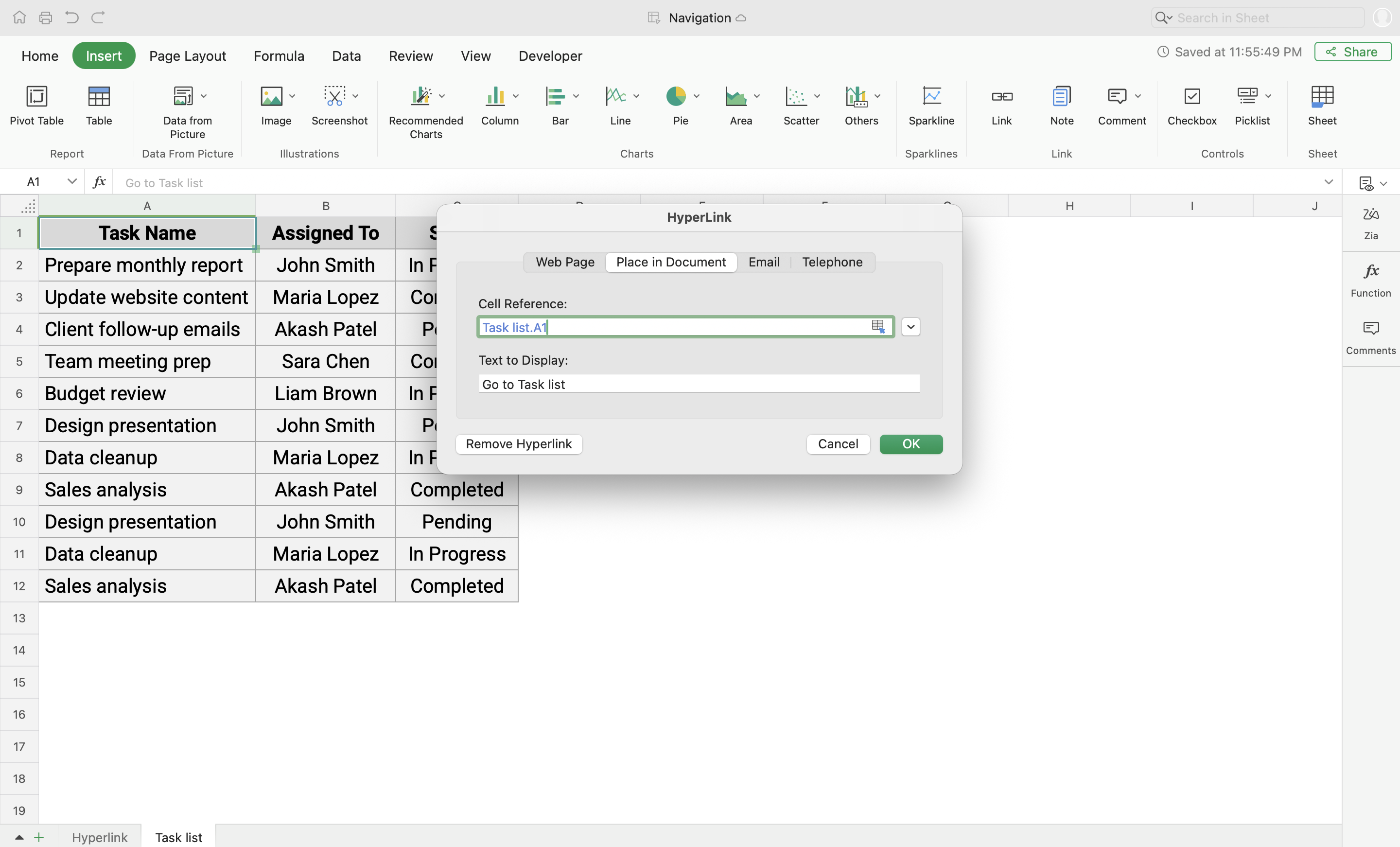 Place in document - To link to any desired cell range inside the file or to a different Zoho Sheet file.