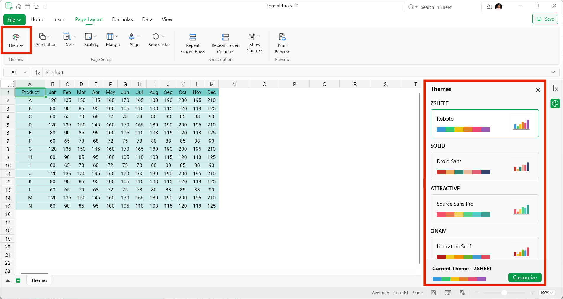 Themes let you style your entire spreadsheet at once—from font colors and cell fills to charts, tables, and more.