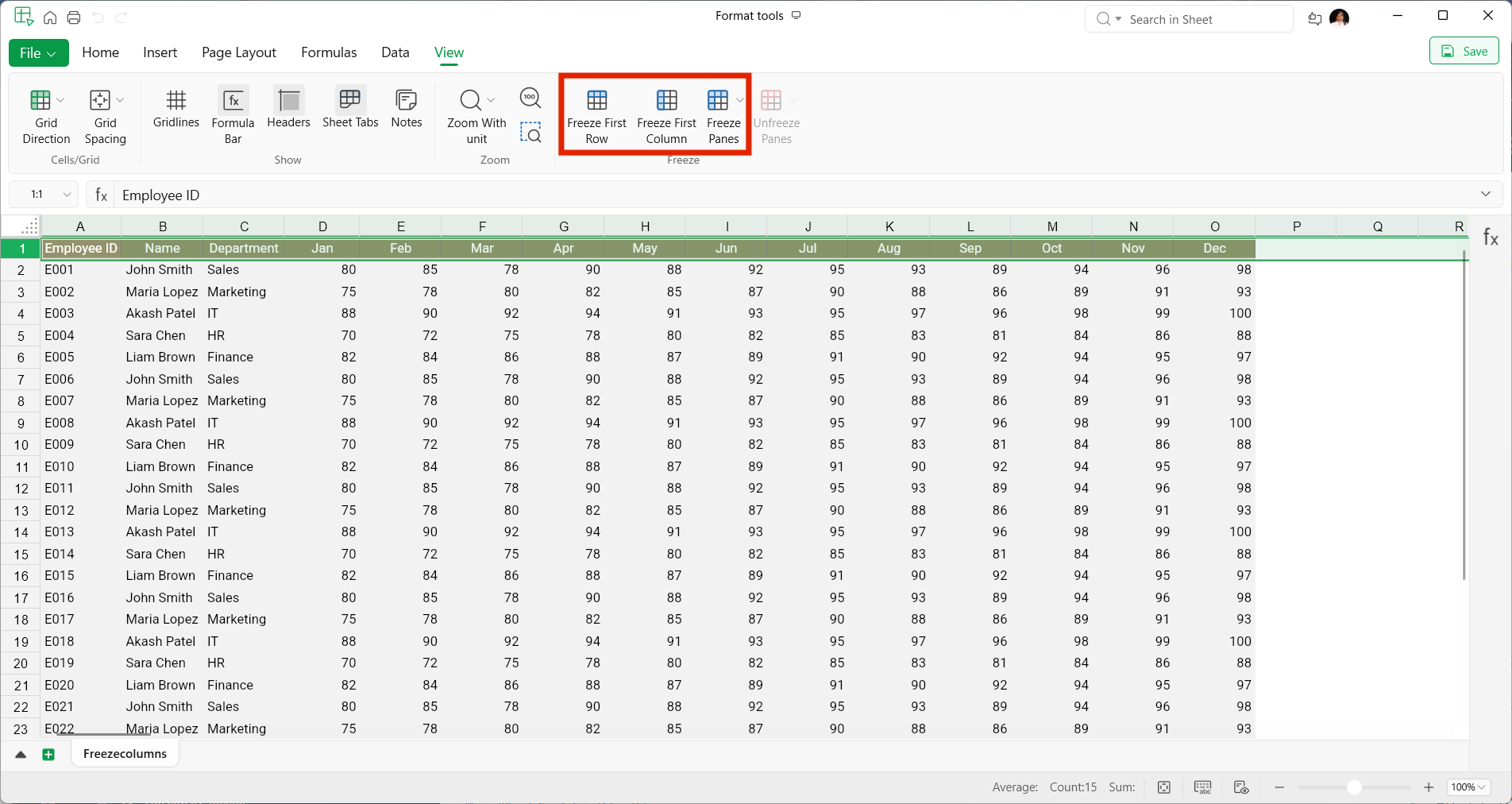 - Use Freeze First Column to keep the first column visible.