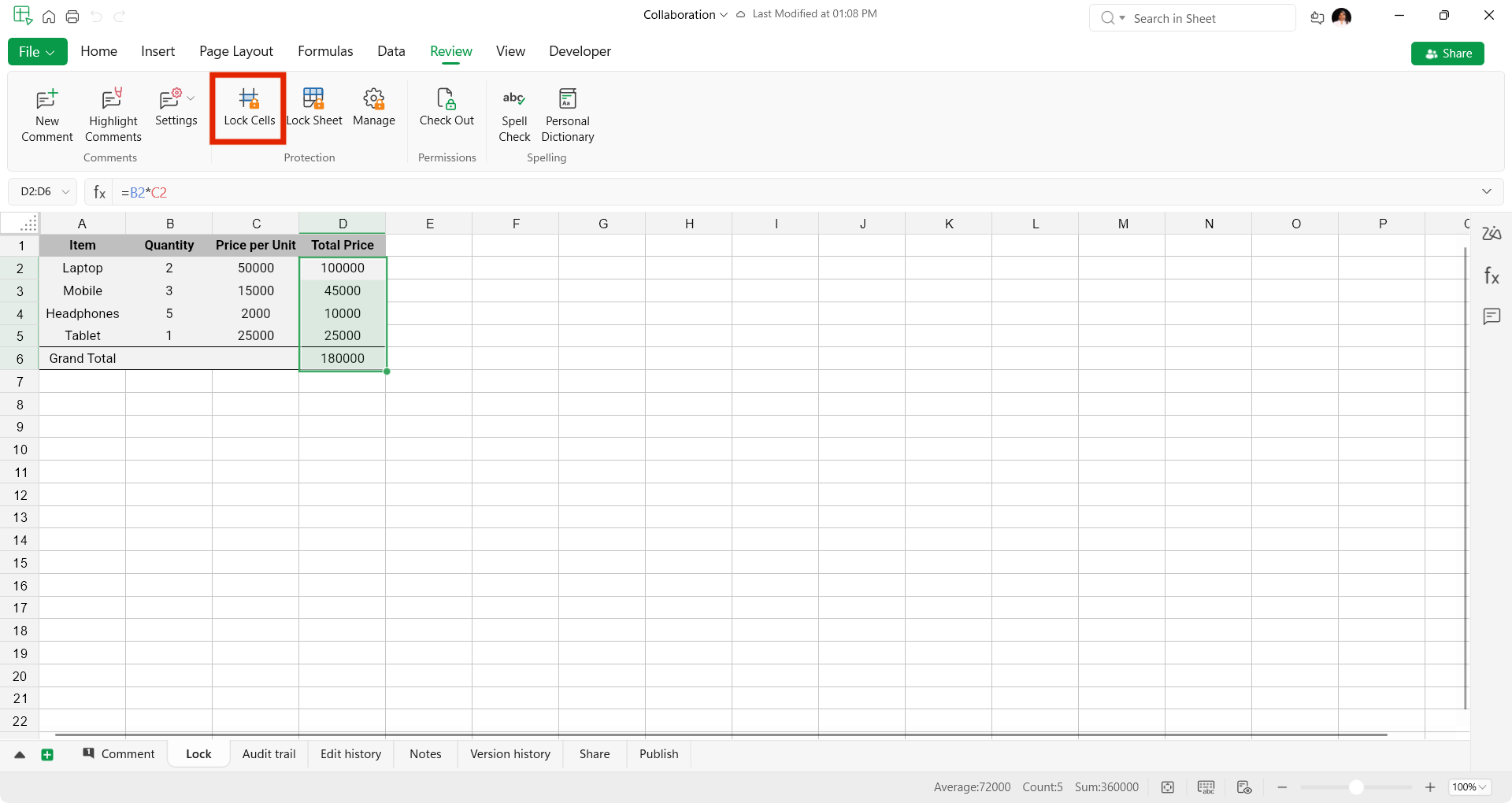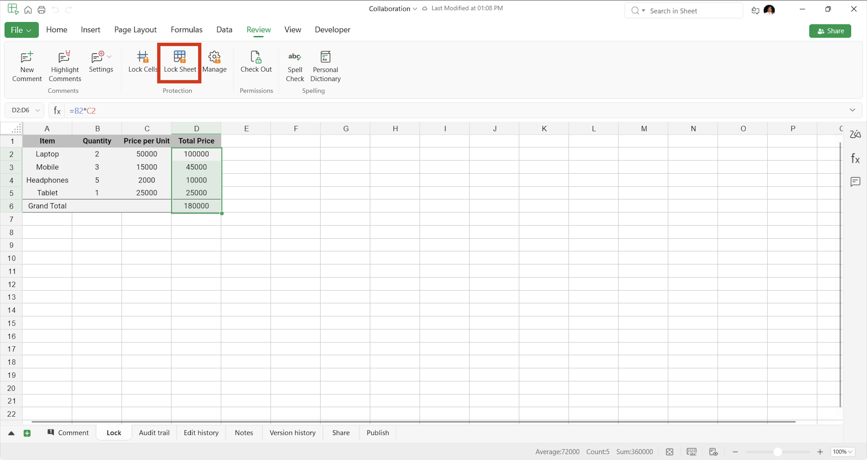 - Click Review and select the Lock Sheet icon
