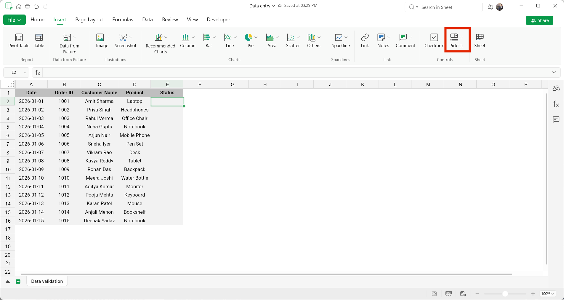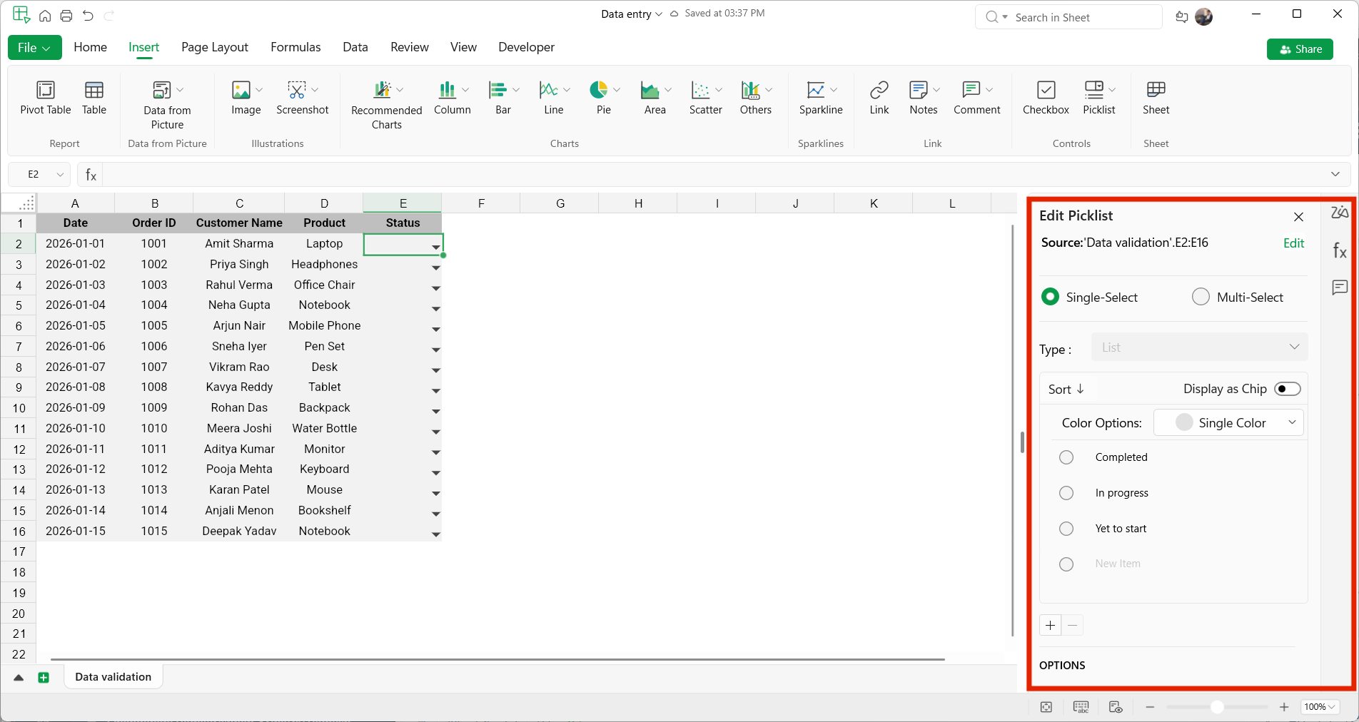 - Go to Insert > Picklist