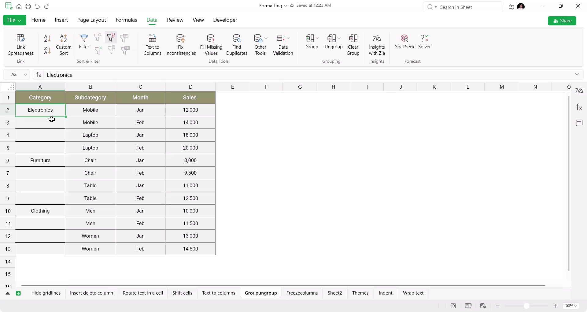 - Go to Data > Group