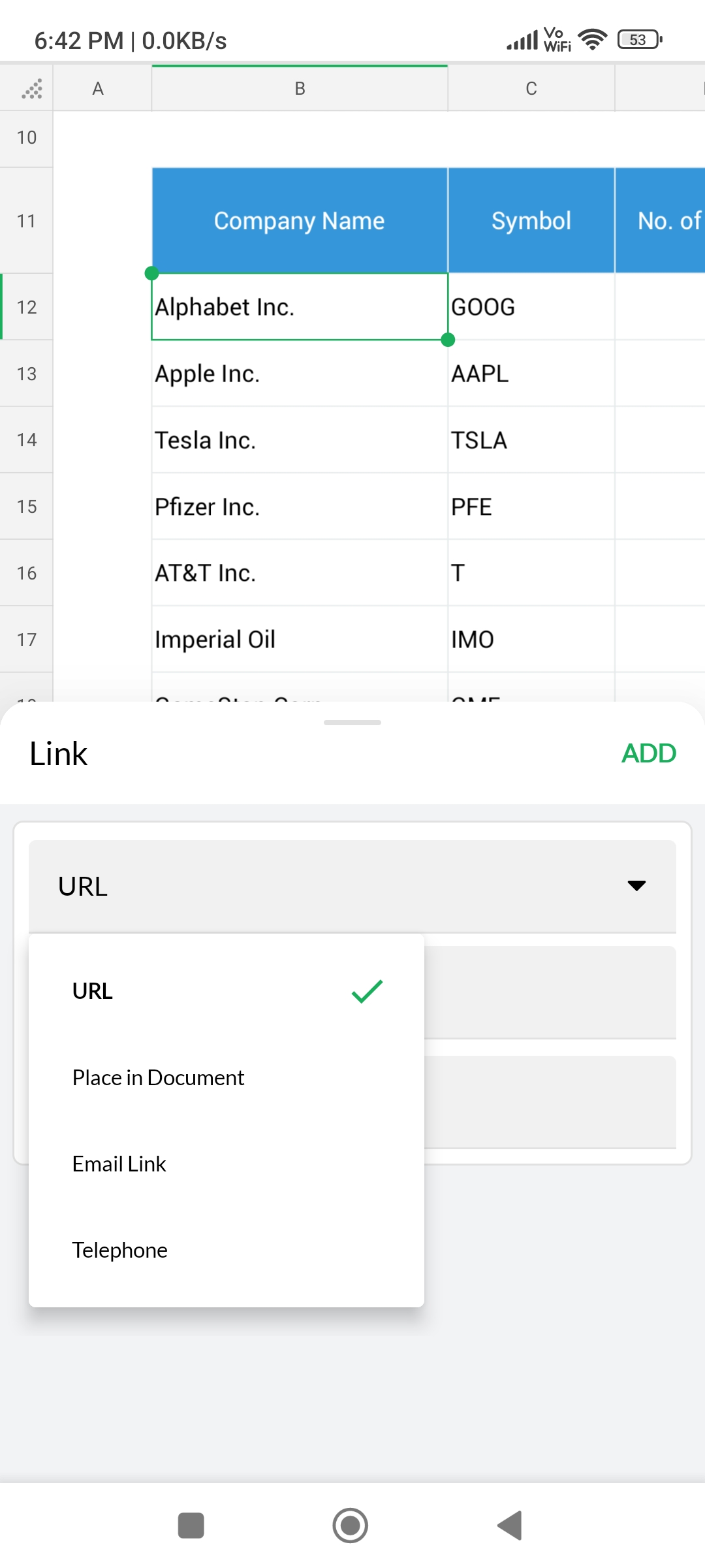 Choose the type of link to insert, and enter the URL, cell range, or email address respectively.