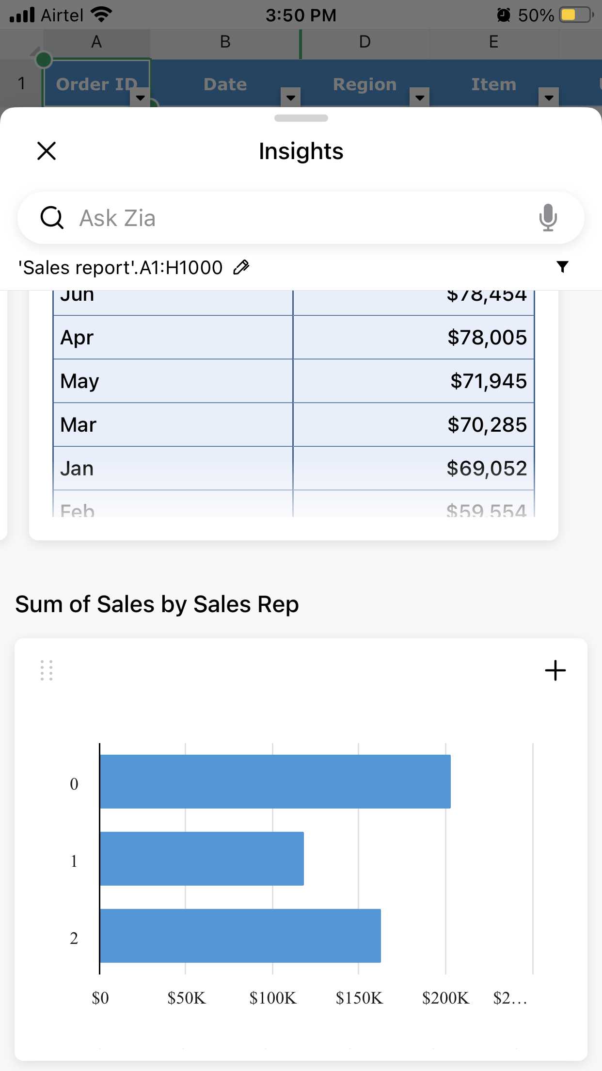 Insights by Zia provides you with recommended charts, pivot tables, and insights about your data. You can also ask data-related questions and get instant answers.
