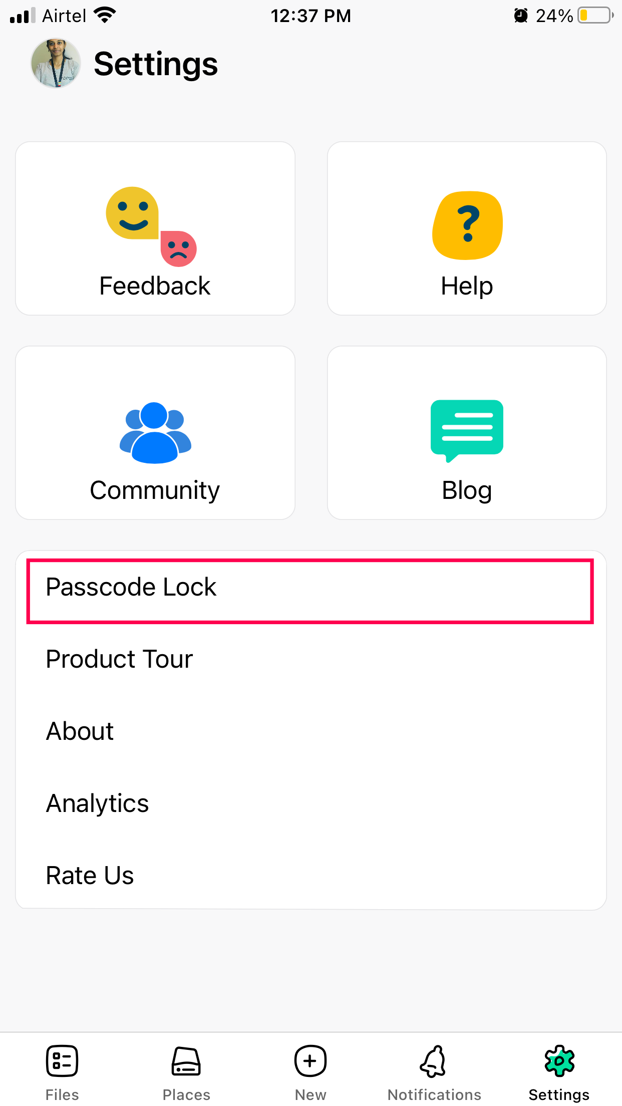 To set a passcode: Go to the file listing page and tap Settings. Select Passcode Lock. Enable the Passcode Lock toggle button. Enter a new passcode in the dialog box that appears.