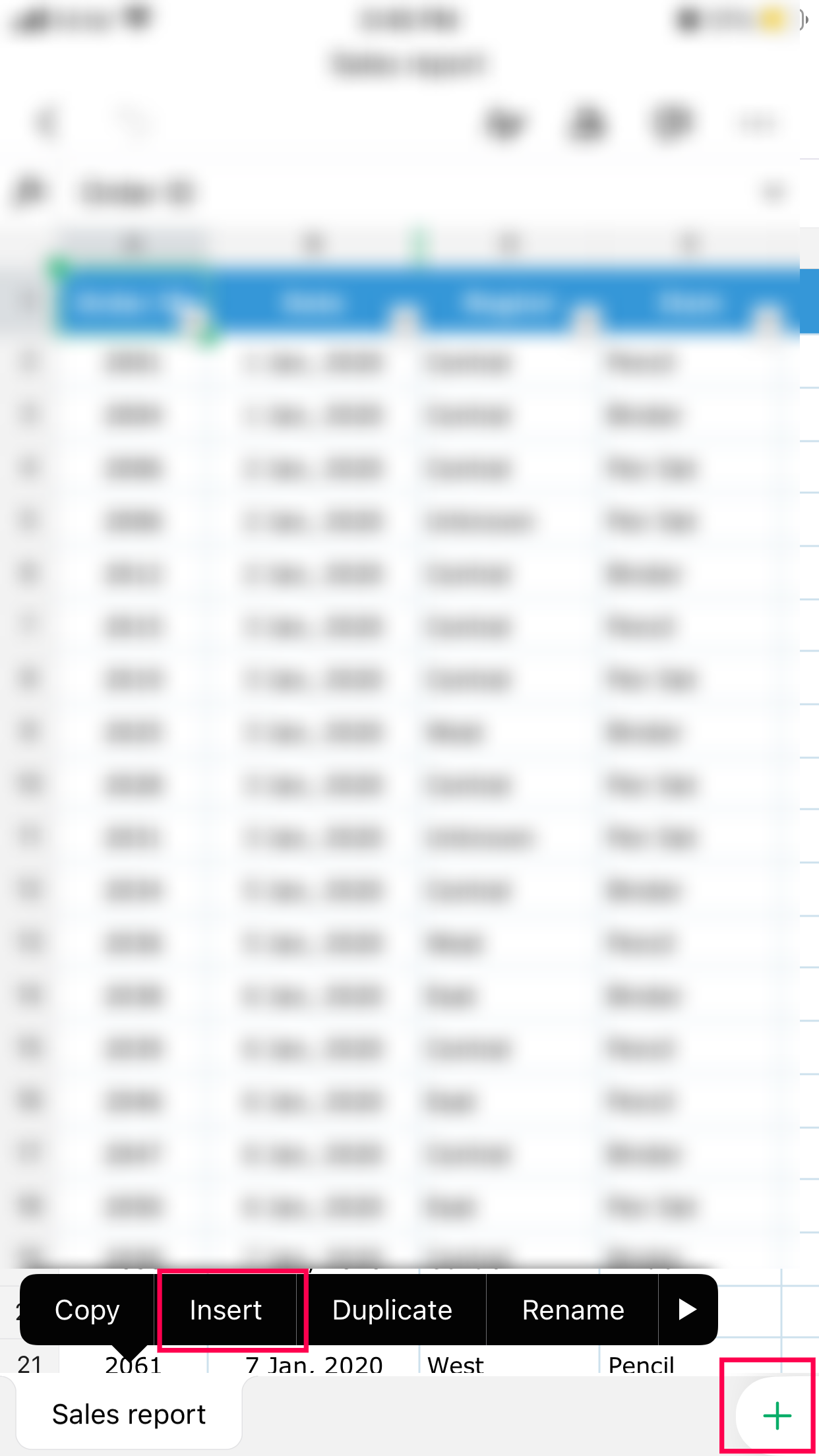 1. Tap on the + icon in the Sheet Tab Bar, or tap on the sheet after which you wish to insert a new sheet.
