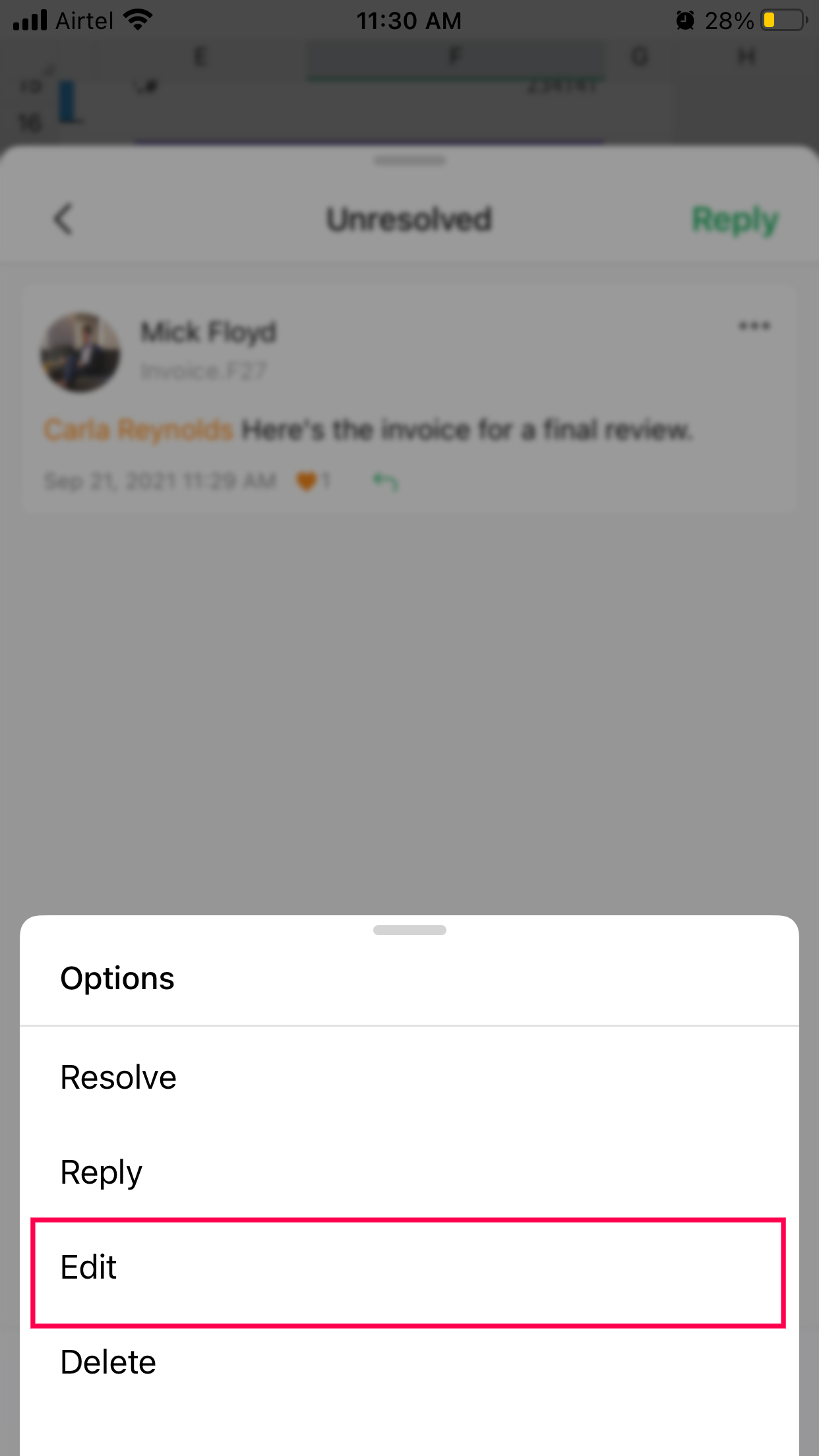 Edit a comment in a spreadsheet | Zoho Sheet for iOS