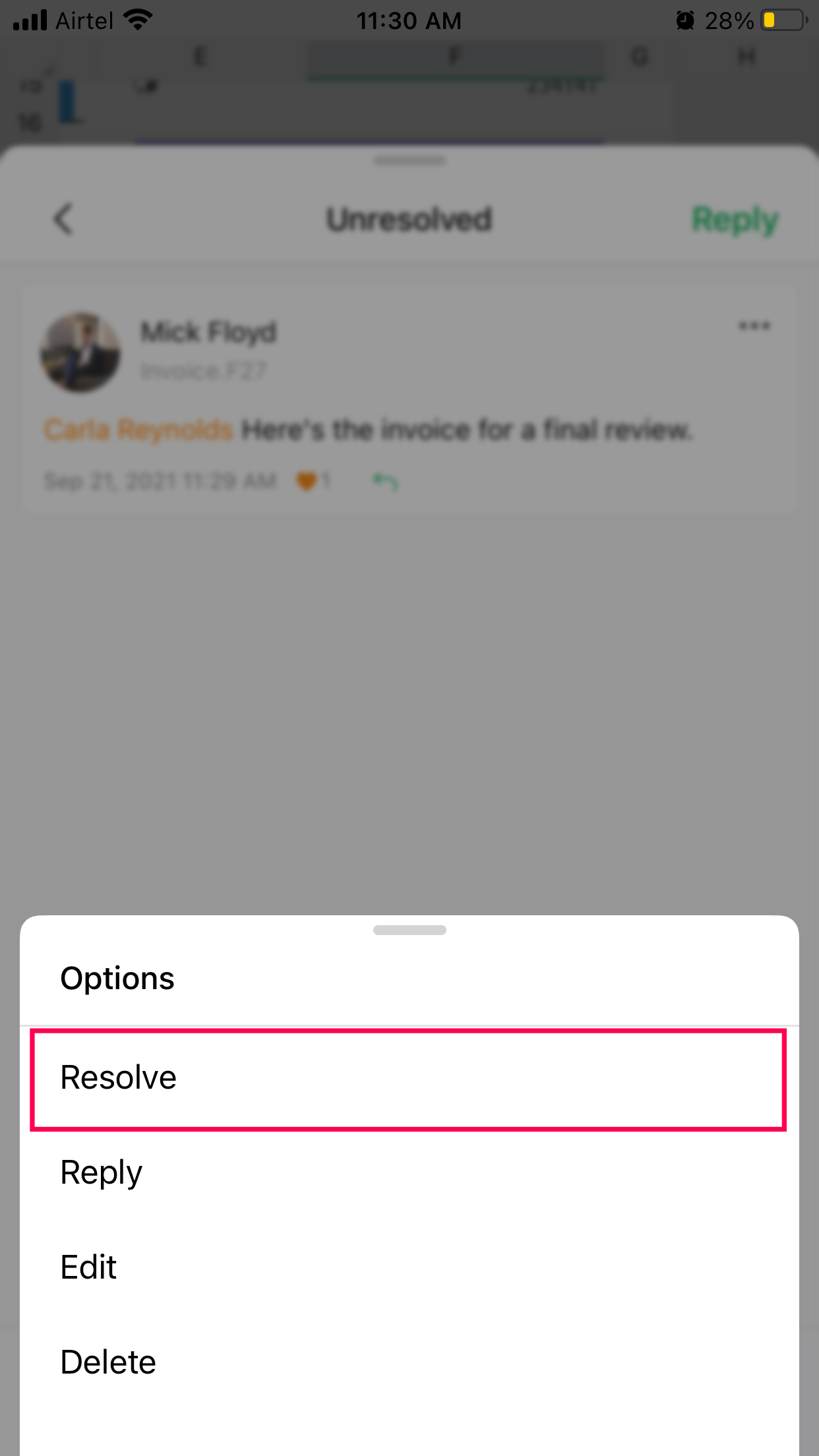 Resolve a comment in a spreadsheet | Zoho Sheet for iOS