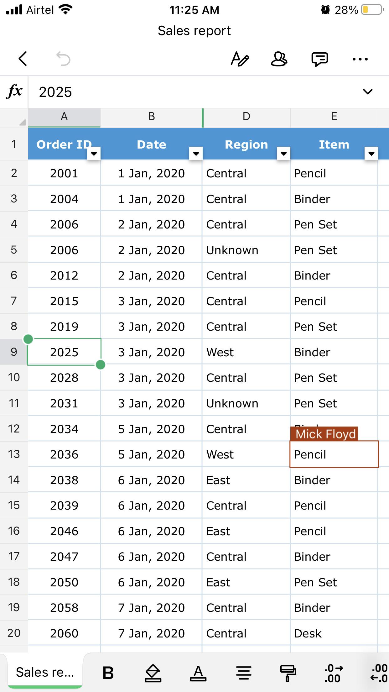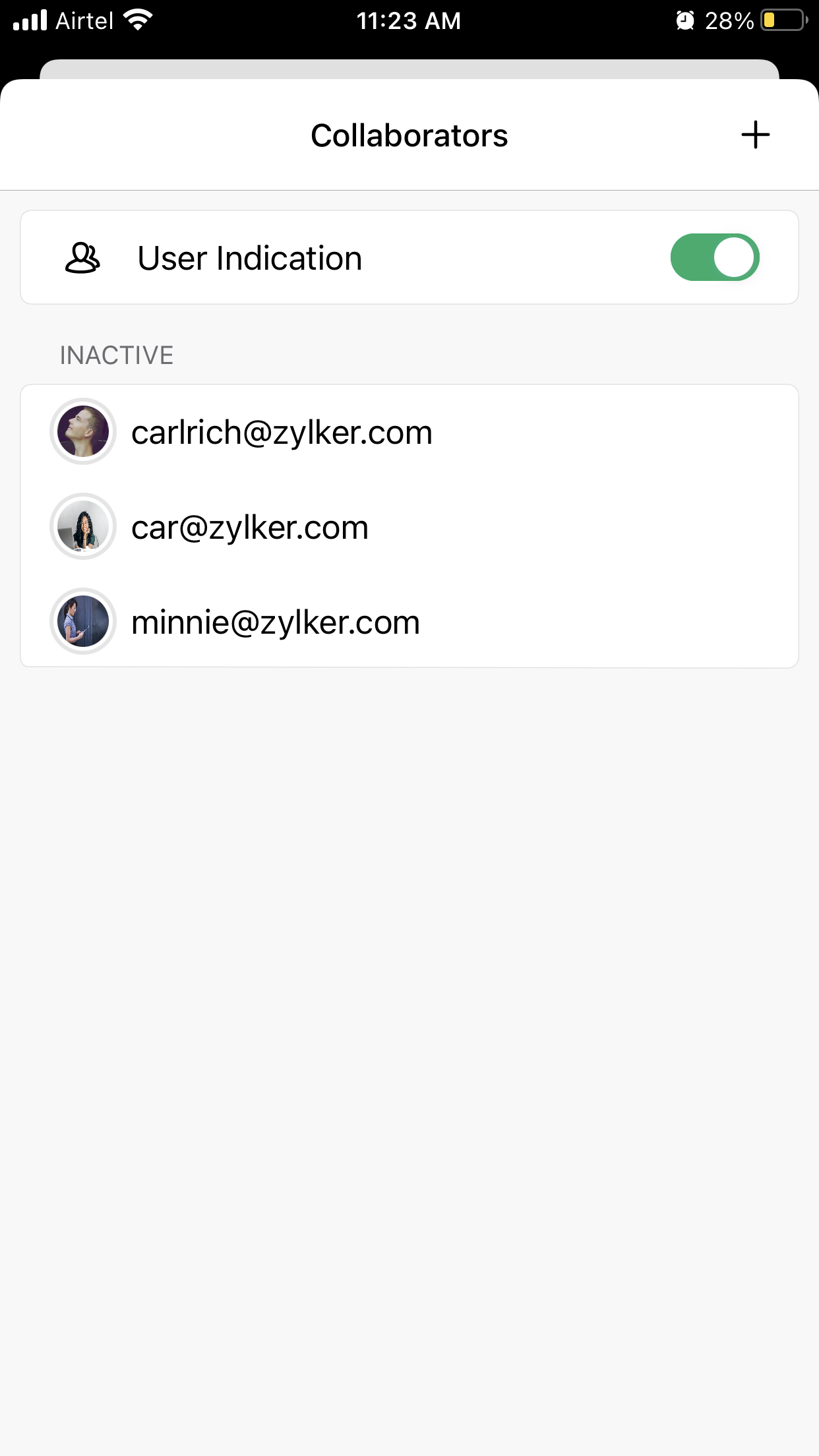 Turning on User Indication will show the collaborator's current position inside the spreadsheet with a user-specific color and name. To turn on user indication: Go to ... Tap Collaborators. Turn on the User Indication toggle switch.