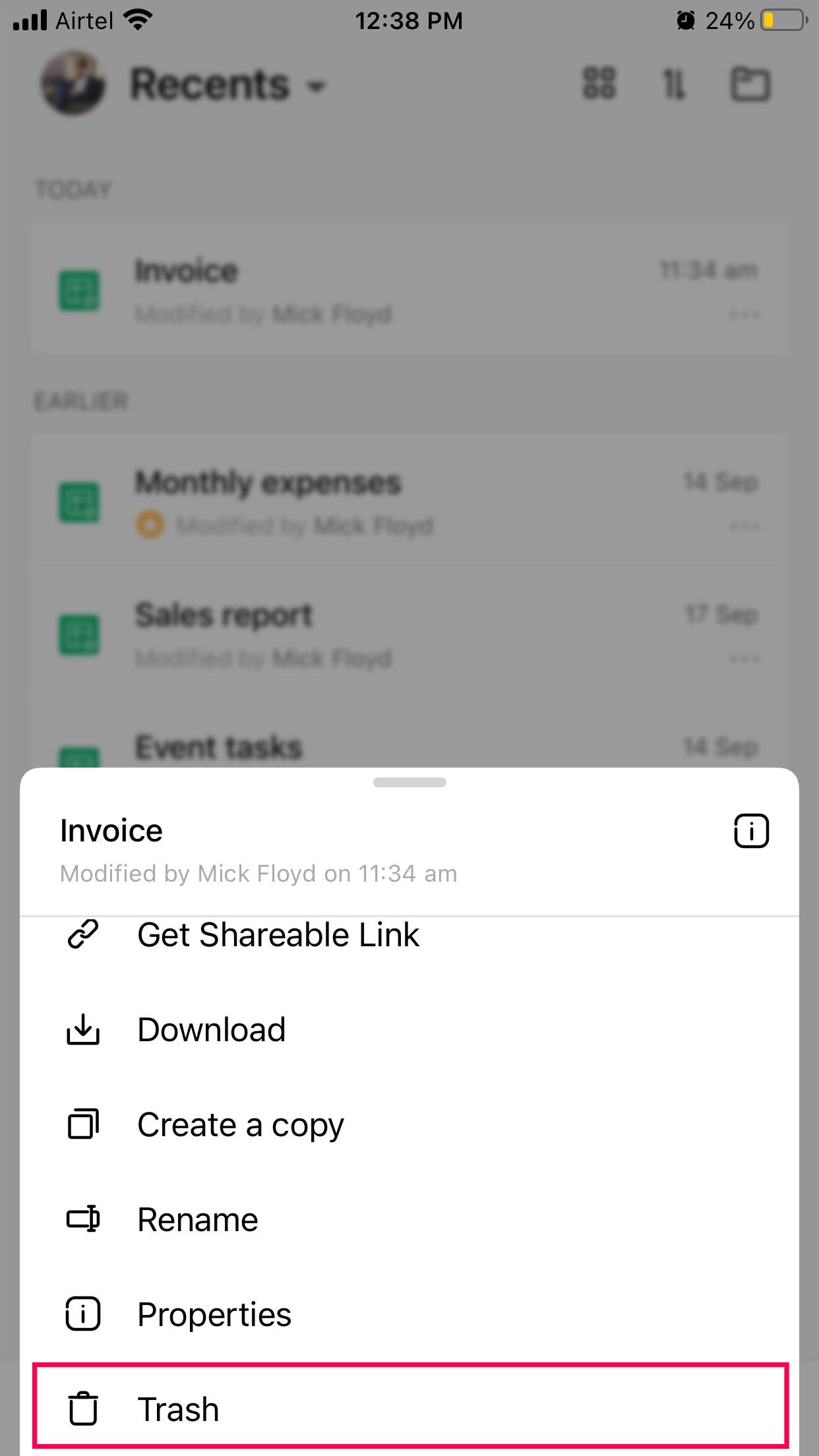 To move a spreadsheet to the trash: Go to ... near the respective file name on the file listing screen. Choose Trash.