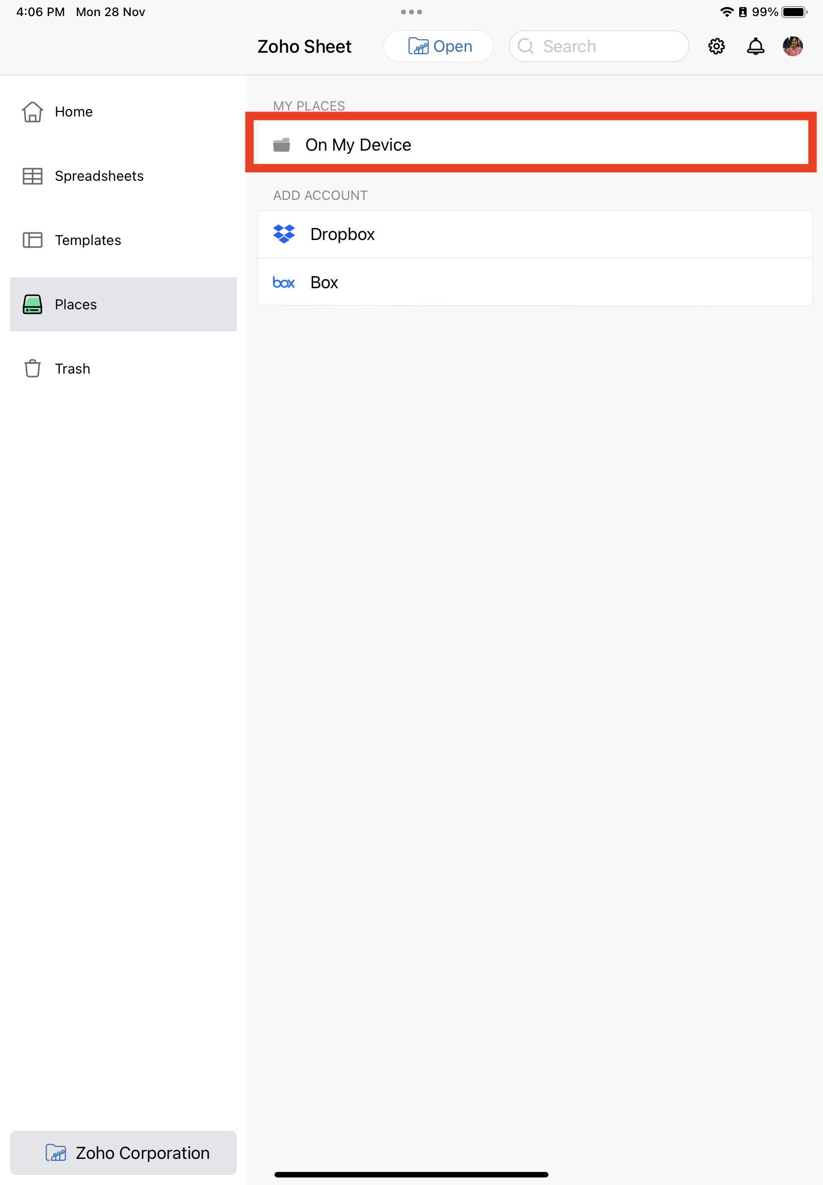 Open a spreadsheet from device storage | Zoho Sheet for iPad