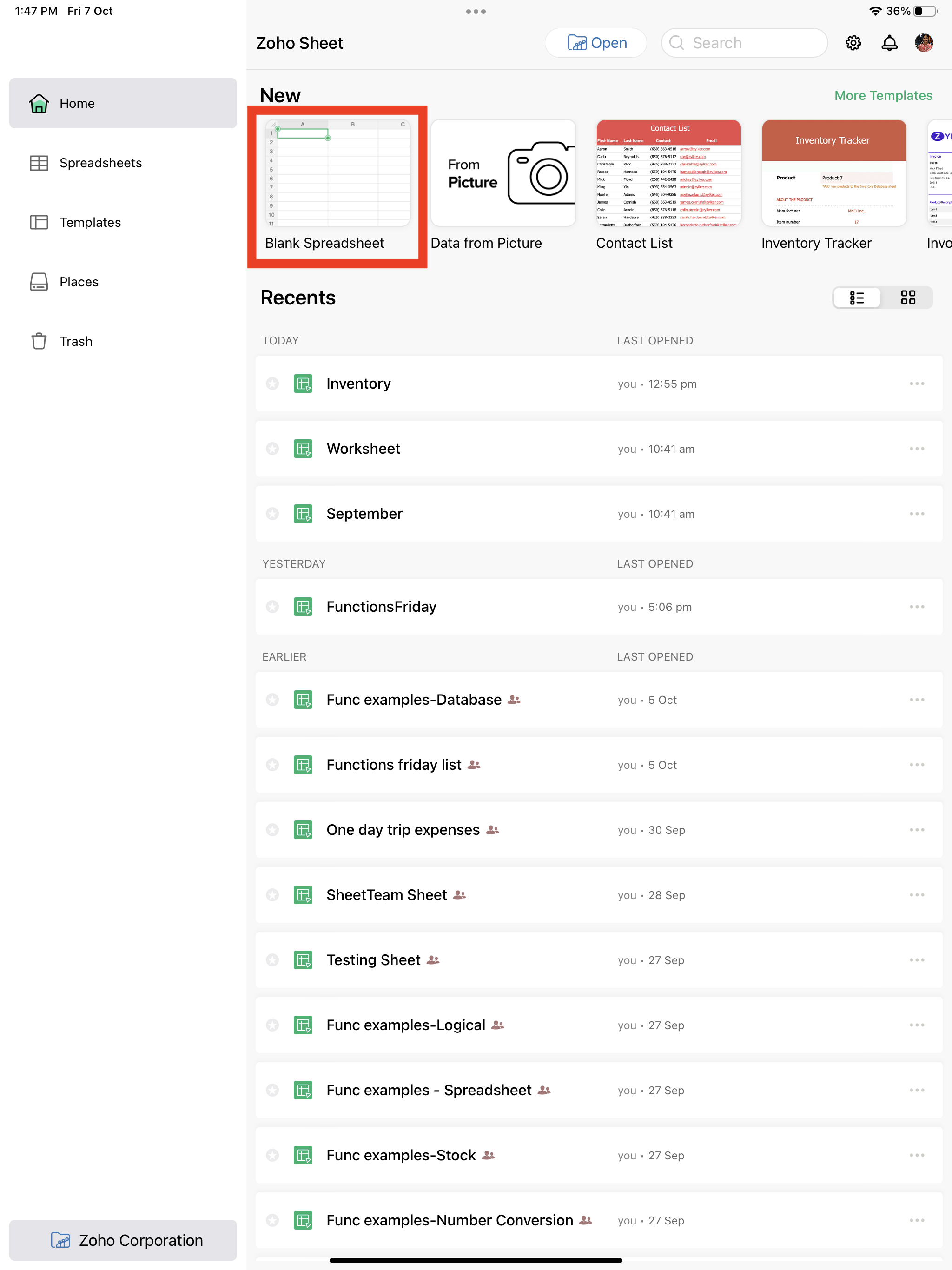 1. Visit the file listing page and tap Blank Spreadsheet.