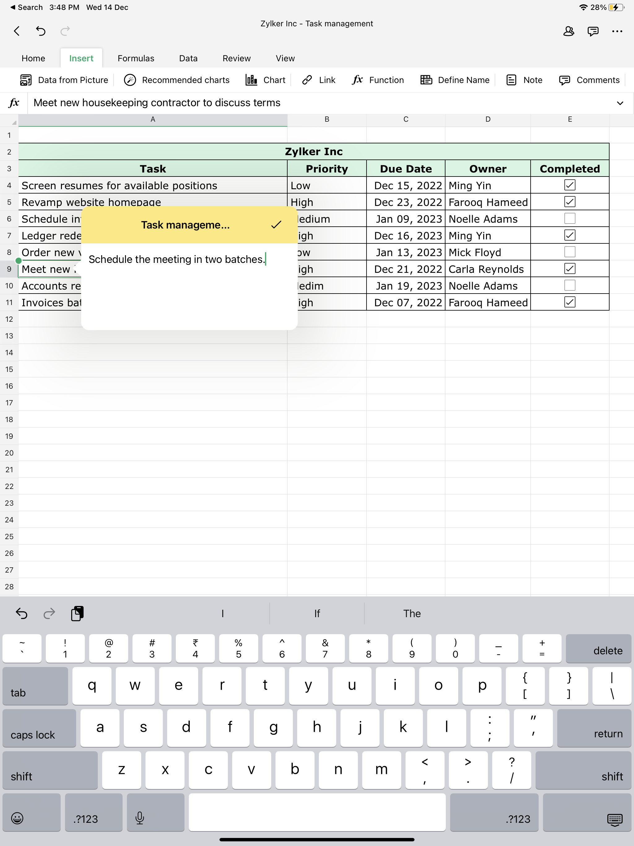 To insert a note: Tap the desired cell on which you wish to insert the note. Go to  icon Under the Insert menu, choose Note. Type in the desired content for the note and tap on ✓.