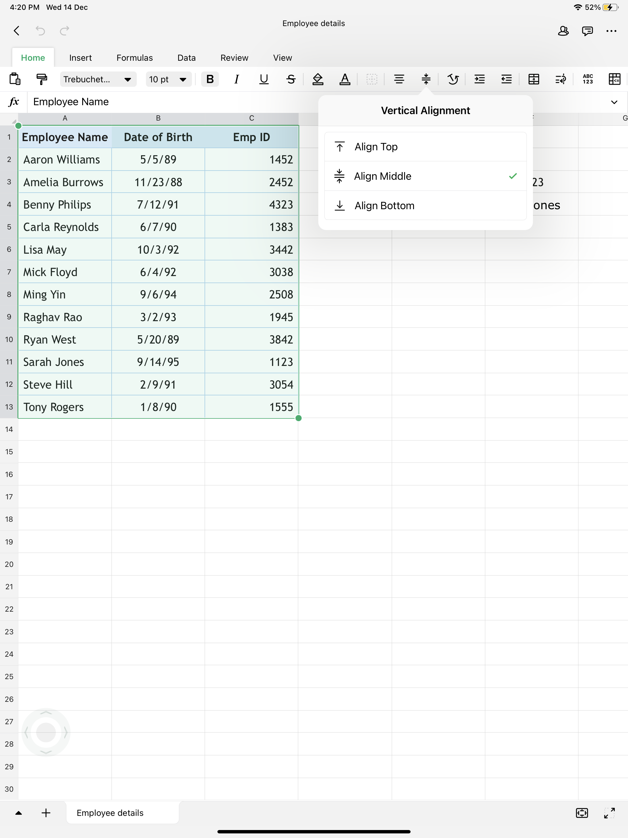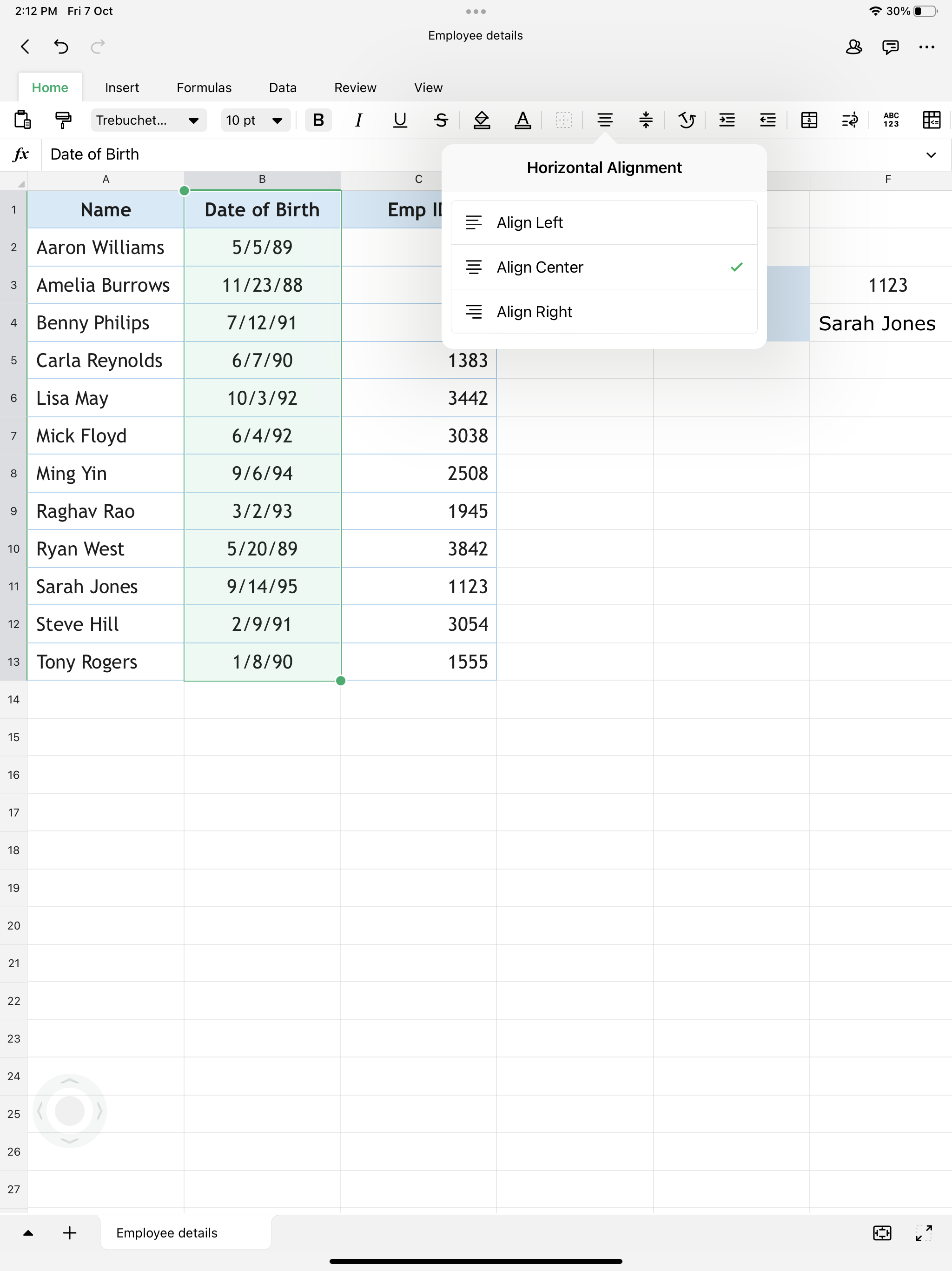 Tap on the cell that you want to format. You can use the Smart Tool Bar at the bottom for quick formats such as Bold, Fill/Text Color, Alignment, and Number Formats. This Smart Tool Bar will show options contextual to the selected data or object. For ...