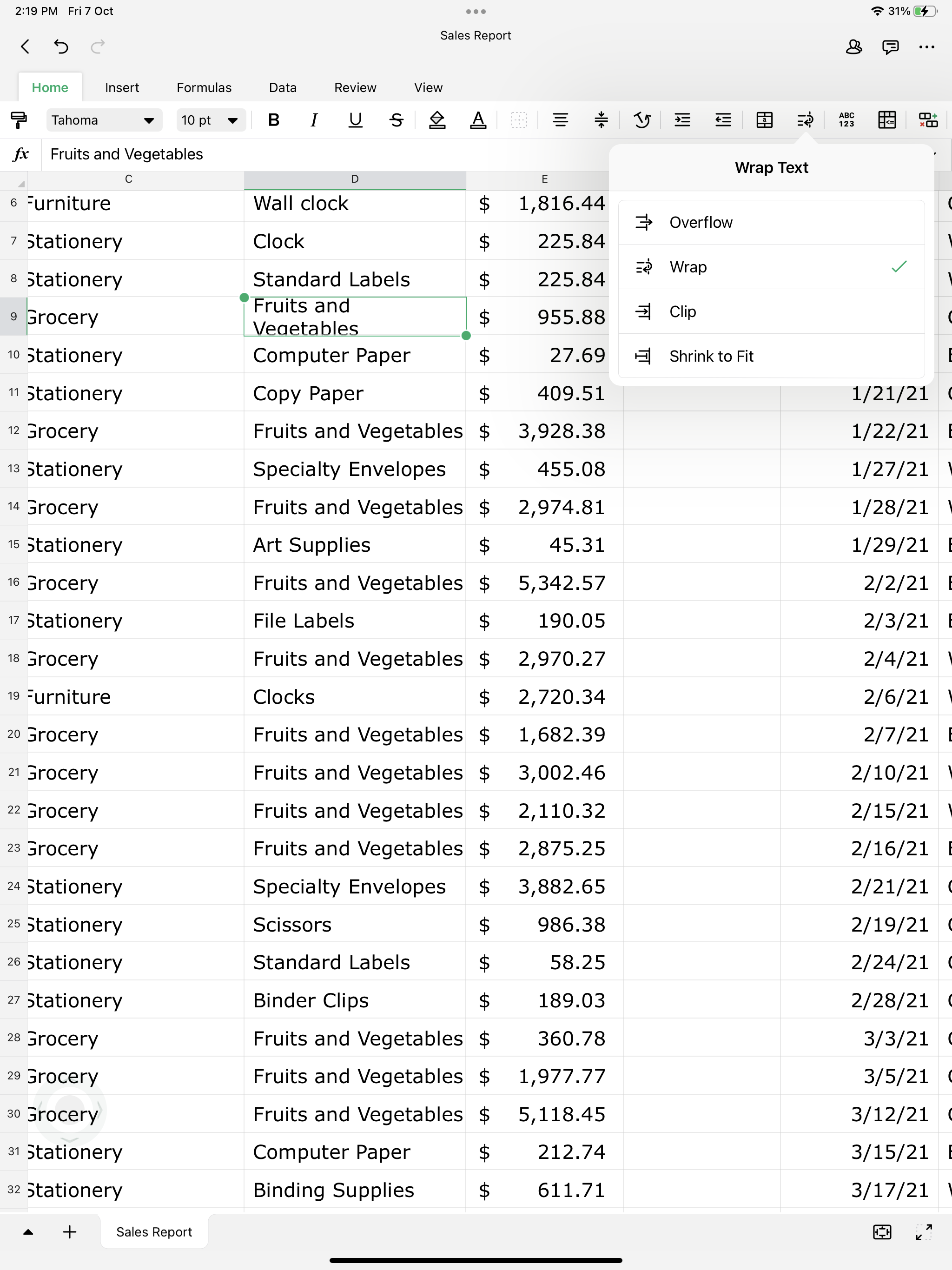 The Wrap Text option allows you to select the way your data/values need to be wrapped around. By default, the text you enter, if exceeds the cell's limit, will overflow to the adjacent cell. The 3 types of text wraps include:
