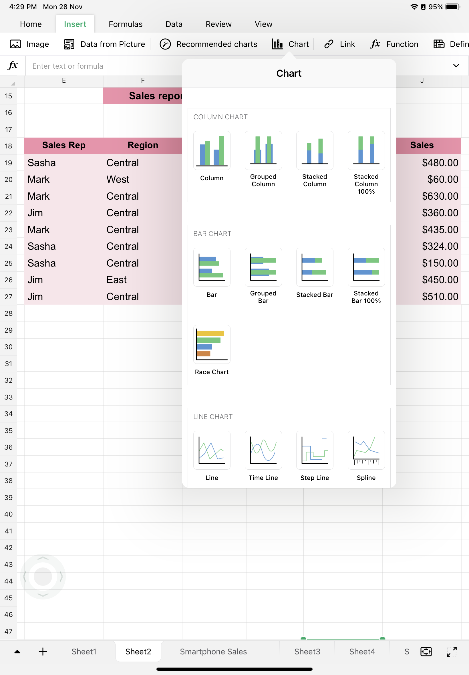 To create a new chart: Select the source data for the desired chart. Go to  and choose Chart under the Insert menu. Tap on the desired chart type from the list of chart types displayed. Once the chart is inserted into the spreadsheet, you can start ...