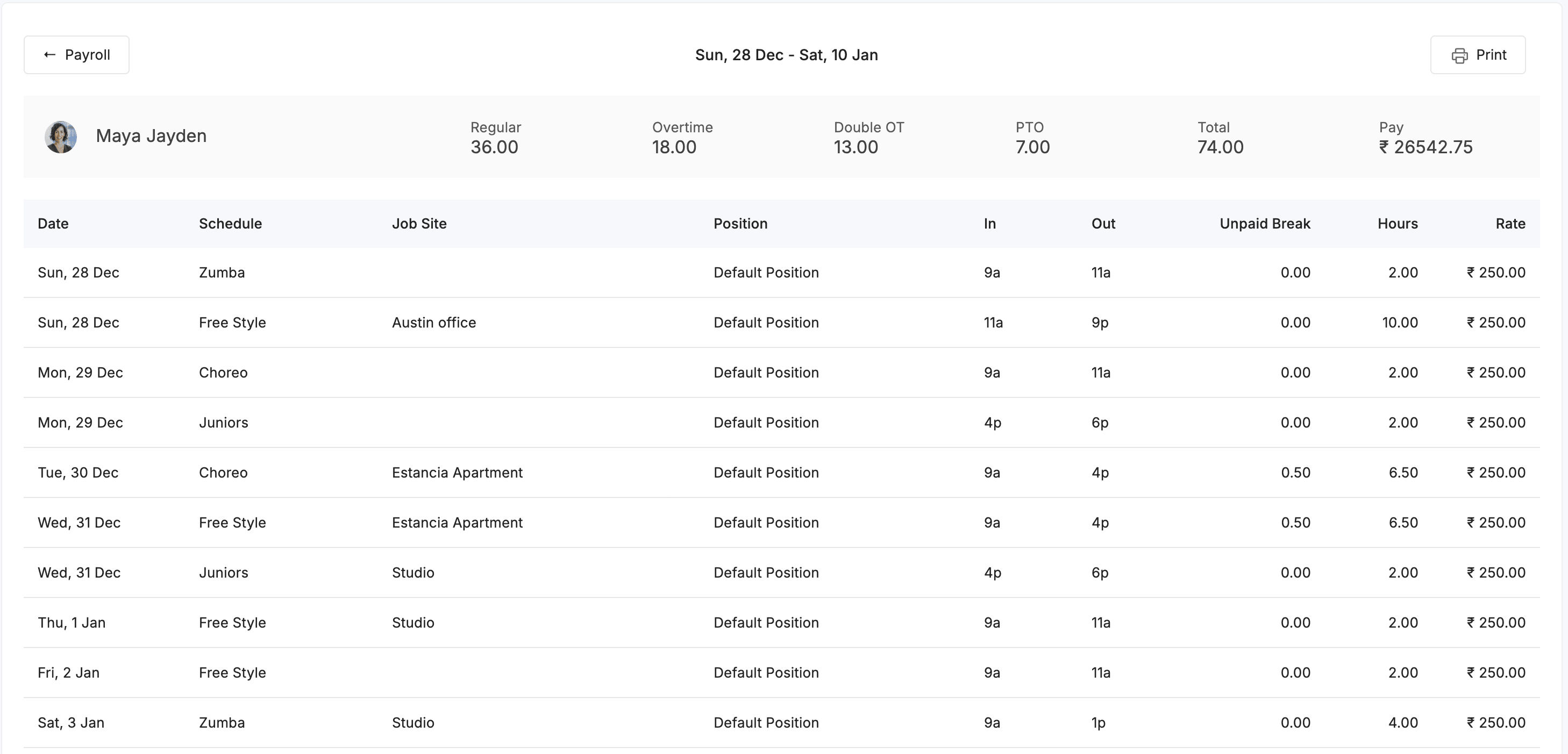 You can view employee specific payroll report by clicking on the employee name in the payroll report. This includes the schedule, position, job site, clock in/out time, unpaid breaks, total worked hours and relevant wages for the selected pay period. This helps in reviewing the employee payroll report.