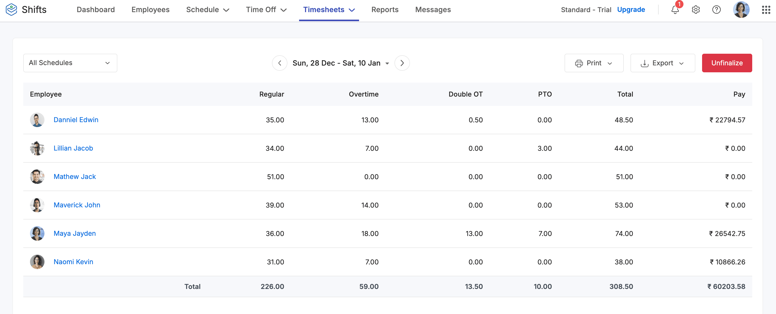 Payroll report allows you to review employee earnings, worked hours, and calculated wages before payroll is finalized. In Zoho Shifts, you can view detailed split of regular worked hours, overtime, double Overtime, paid time-off, total worked hours and relevant wages for the selected pay period.