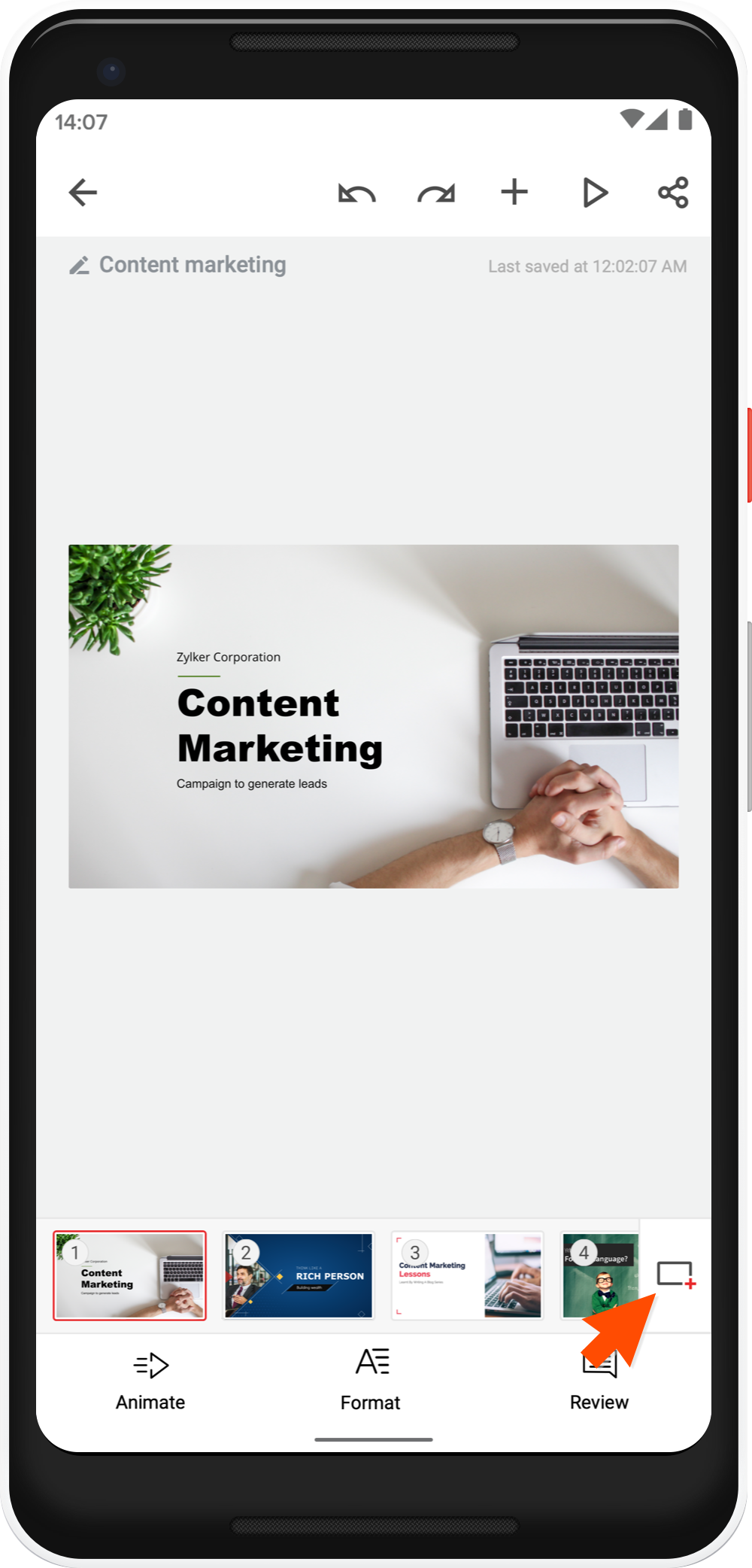 1. Tap the New Slide  icon in the bottom-right corner. By default, this will open with the layout options.