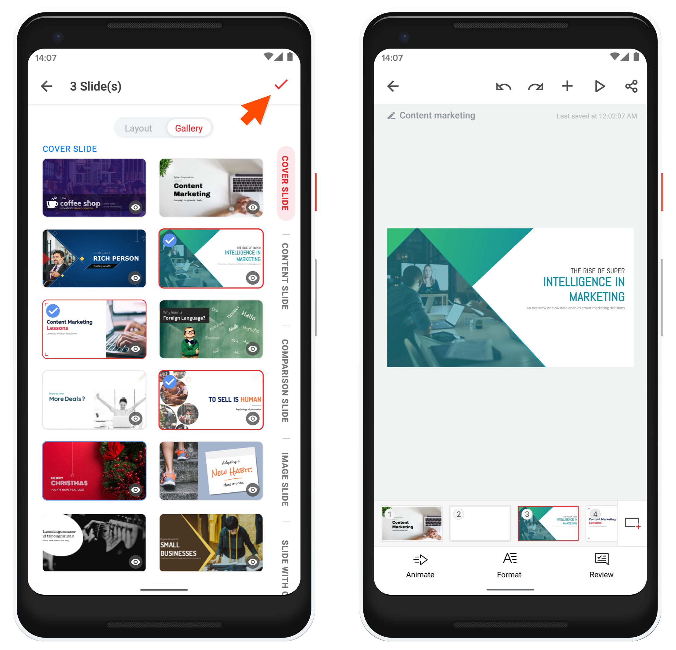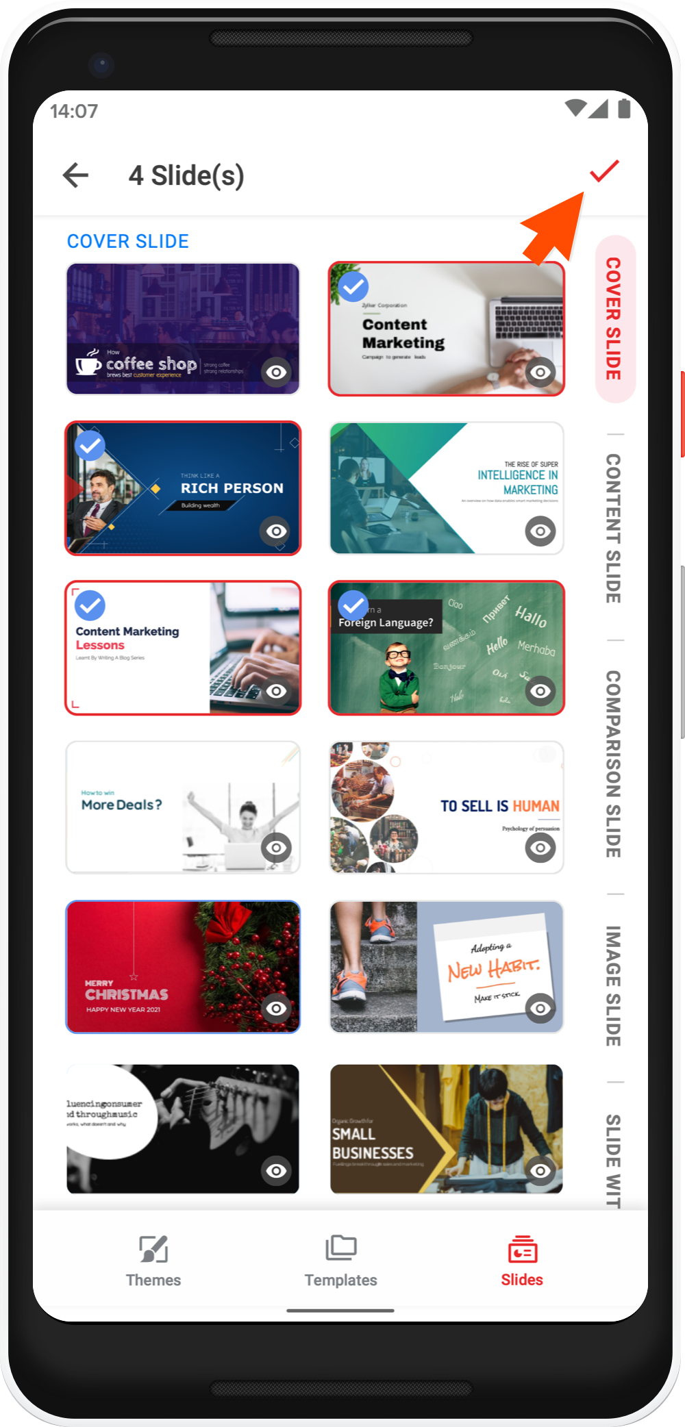 3. Tap to choose the required slides and select the check mark icon in the top-right corner to create a new presentation.