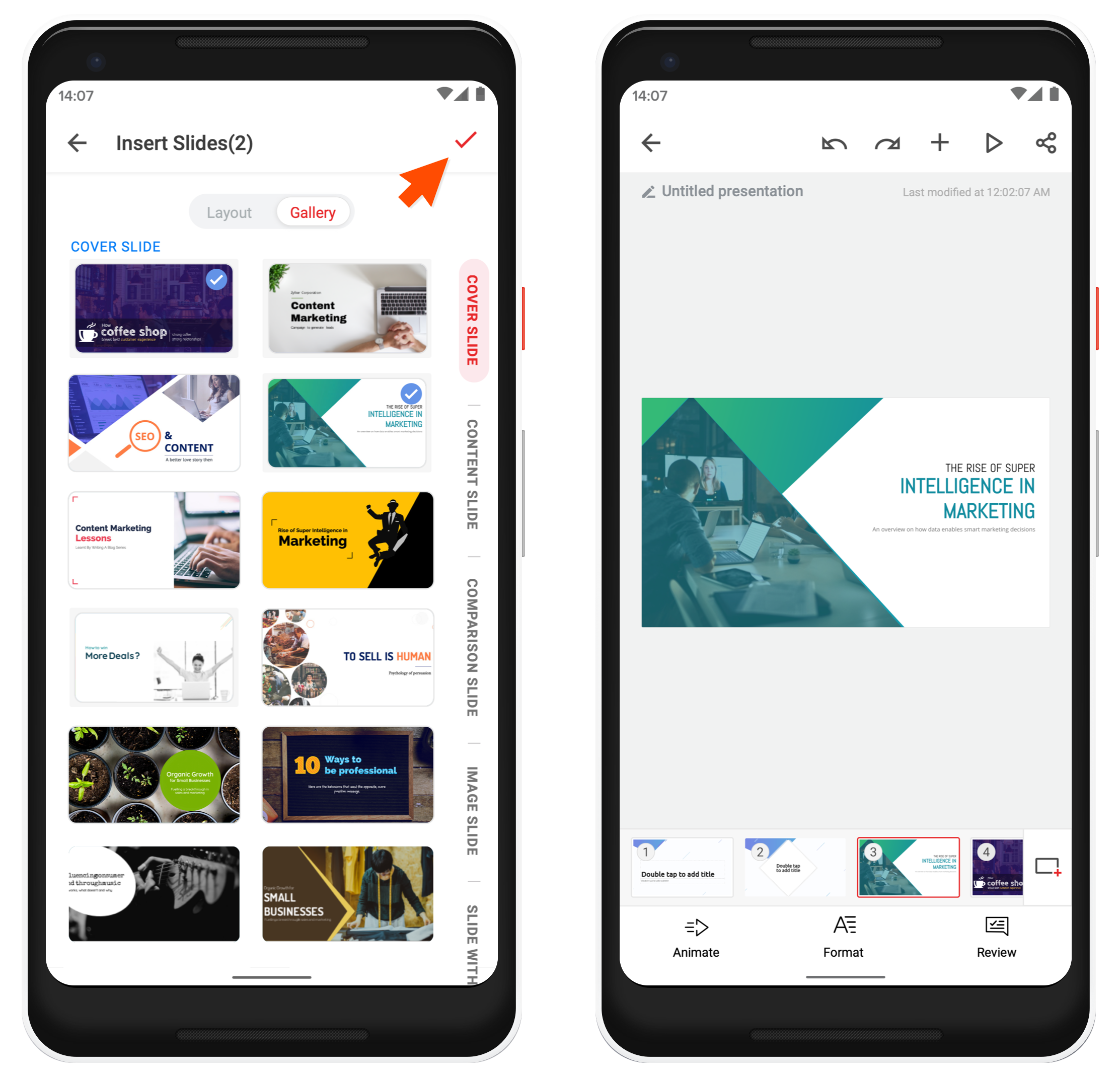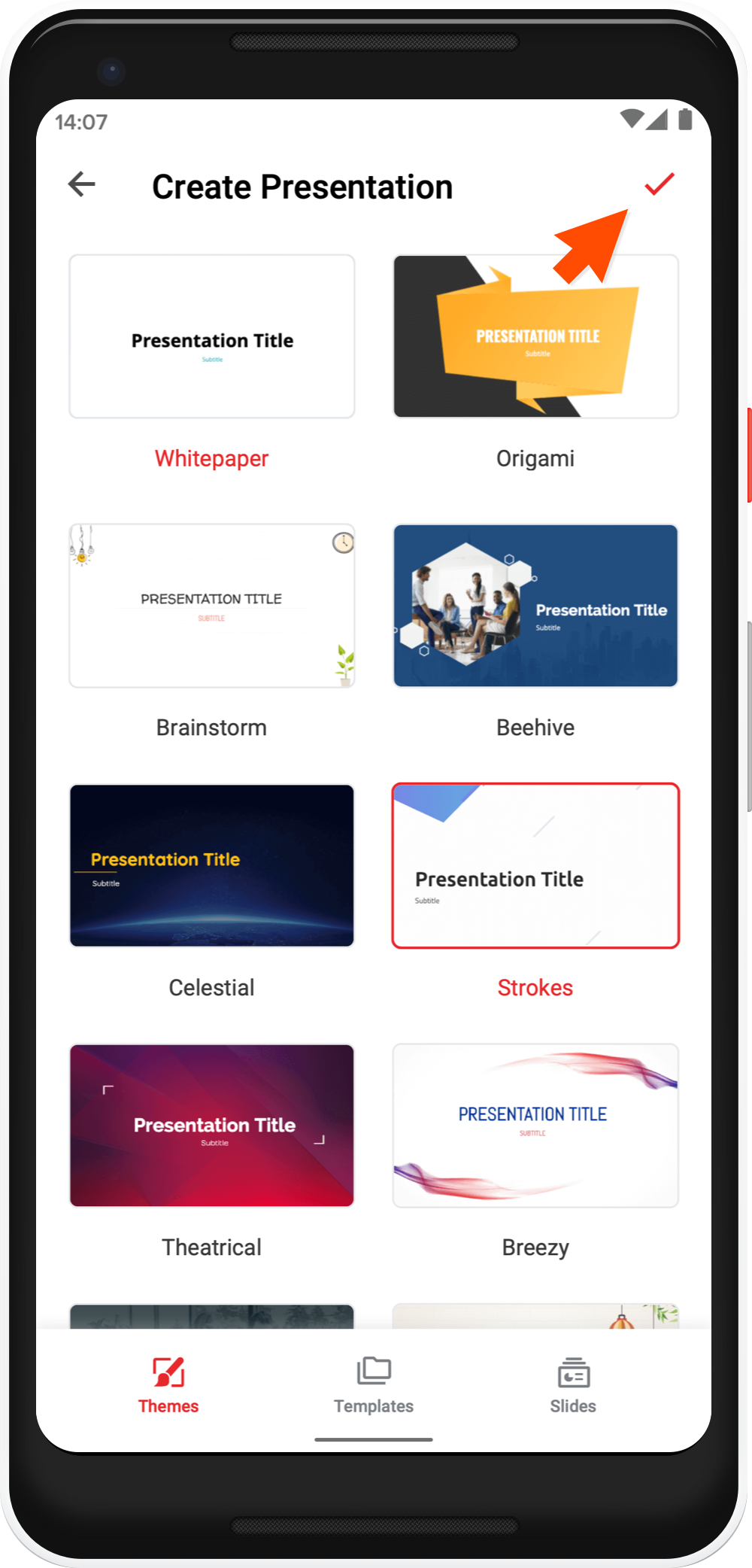2. To select your theme, tap your preferred theme thumbnail and tap the check mark   in the top-right corner. A new slide with the selected theme will appear.