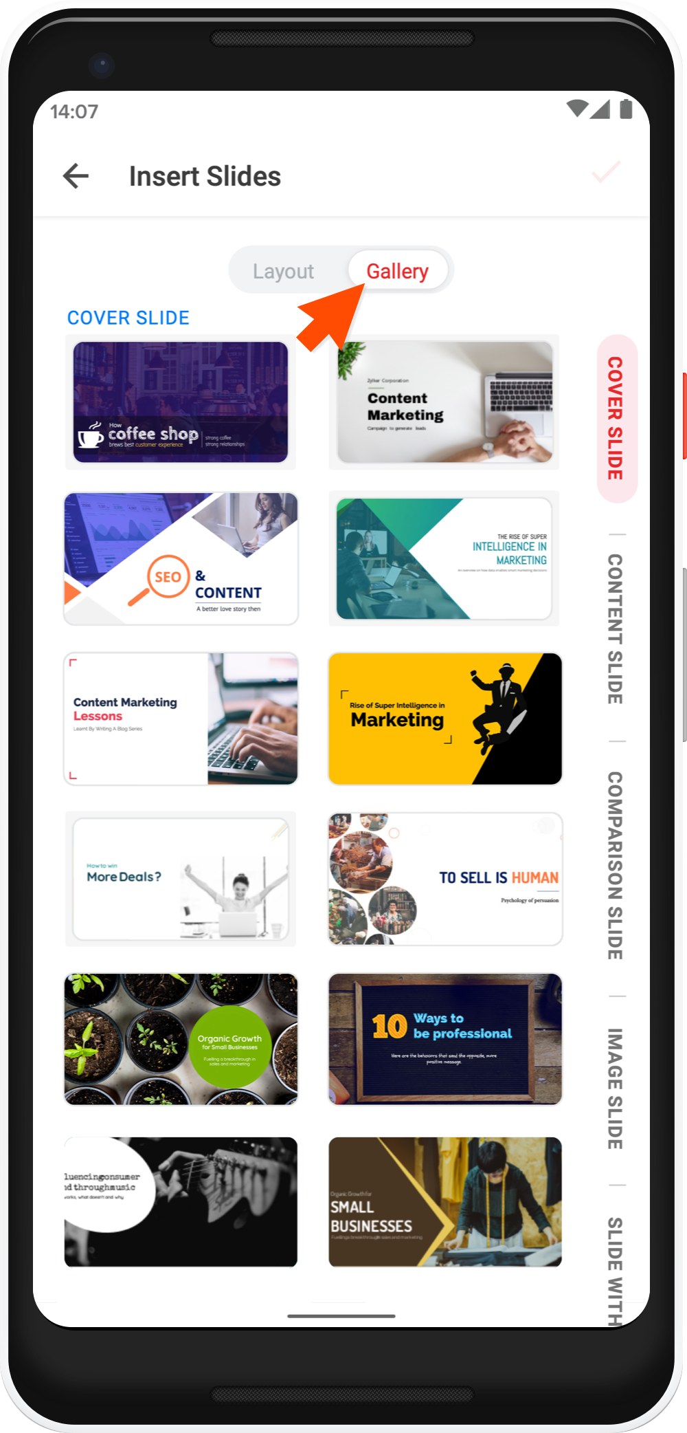 You can create presentations with predesigned slides using Show app for Android. The slides are categorized into cover, content, comparison, image, quote, and end slides. You can select the slides you require to create presentations on the go. To ...