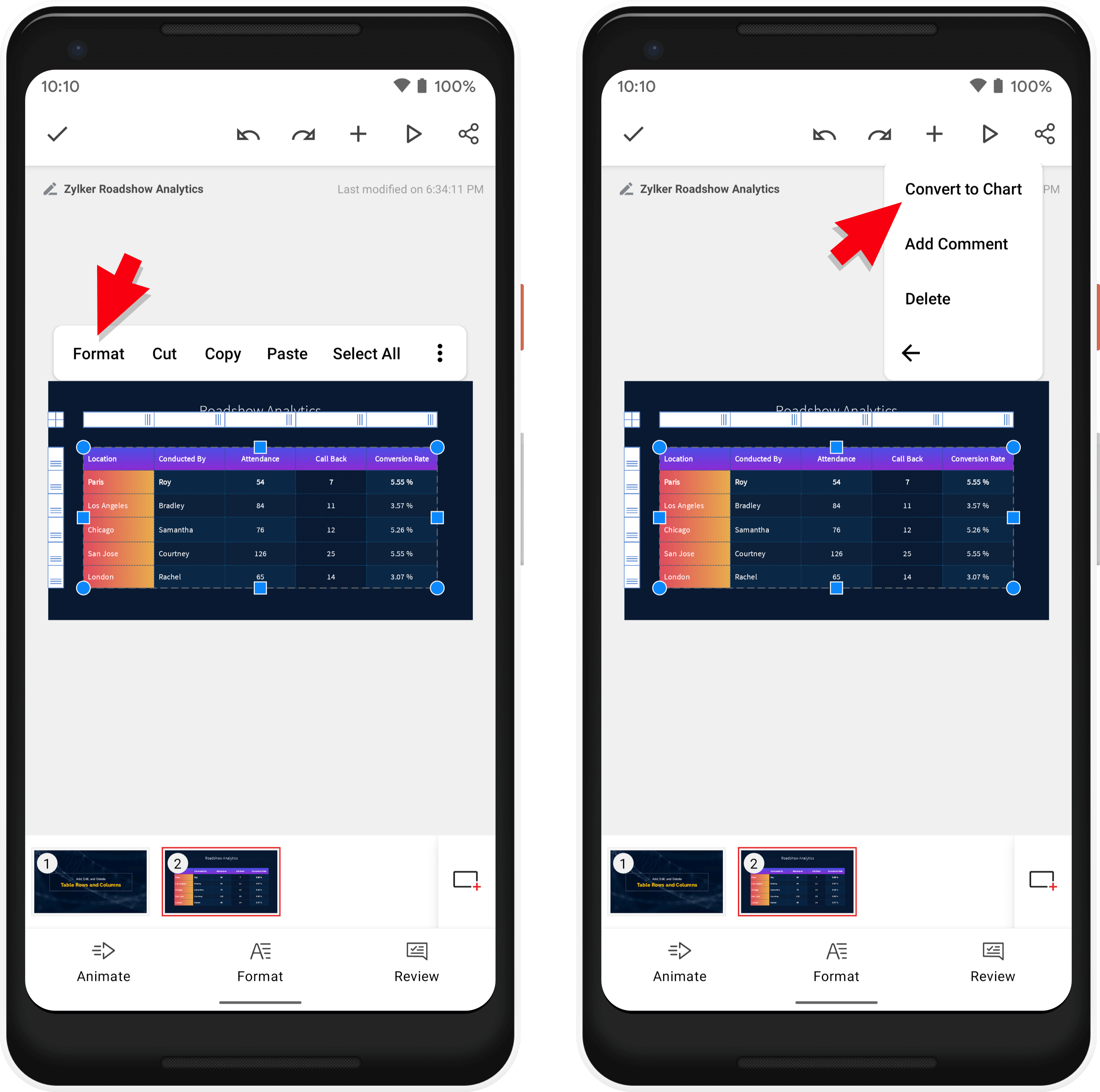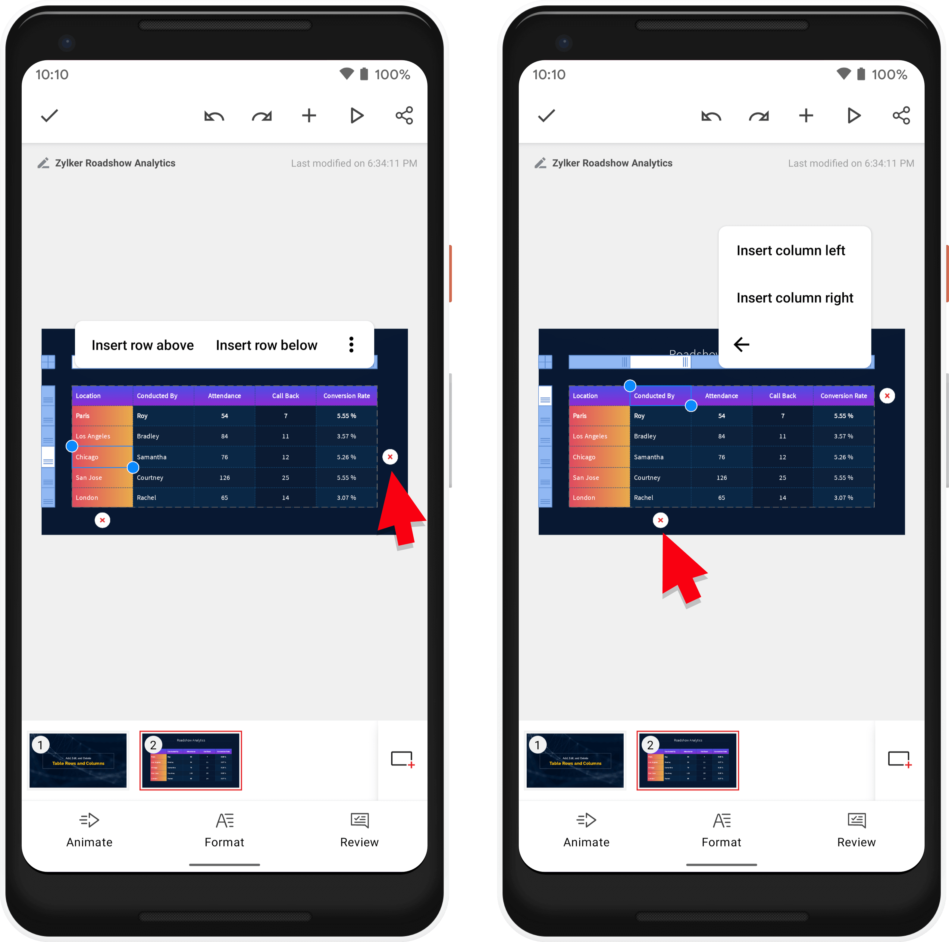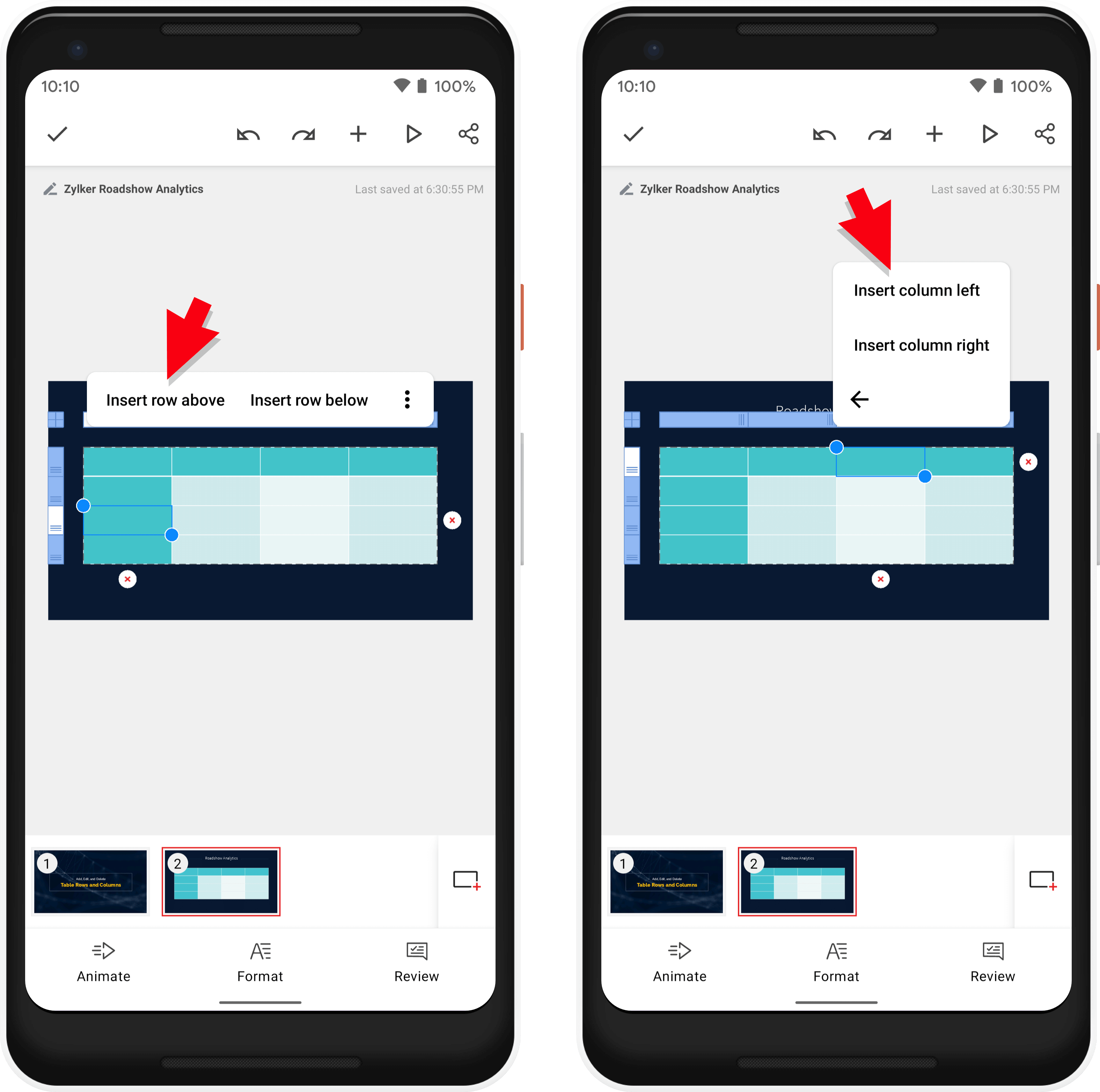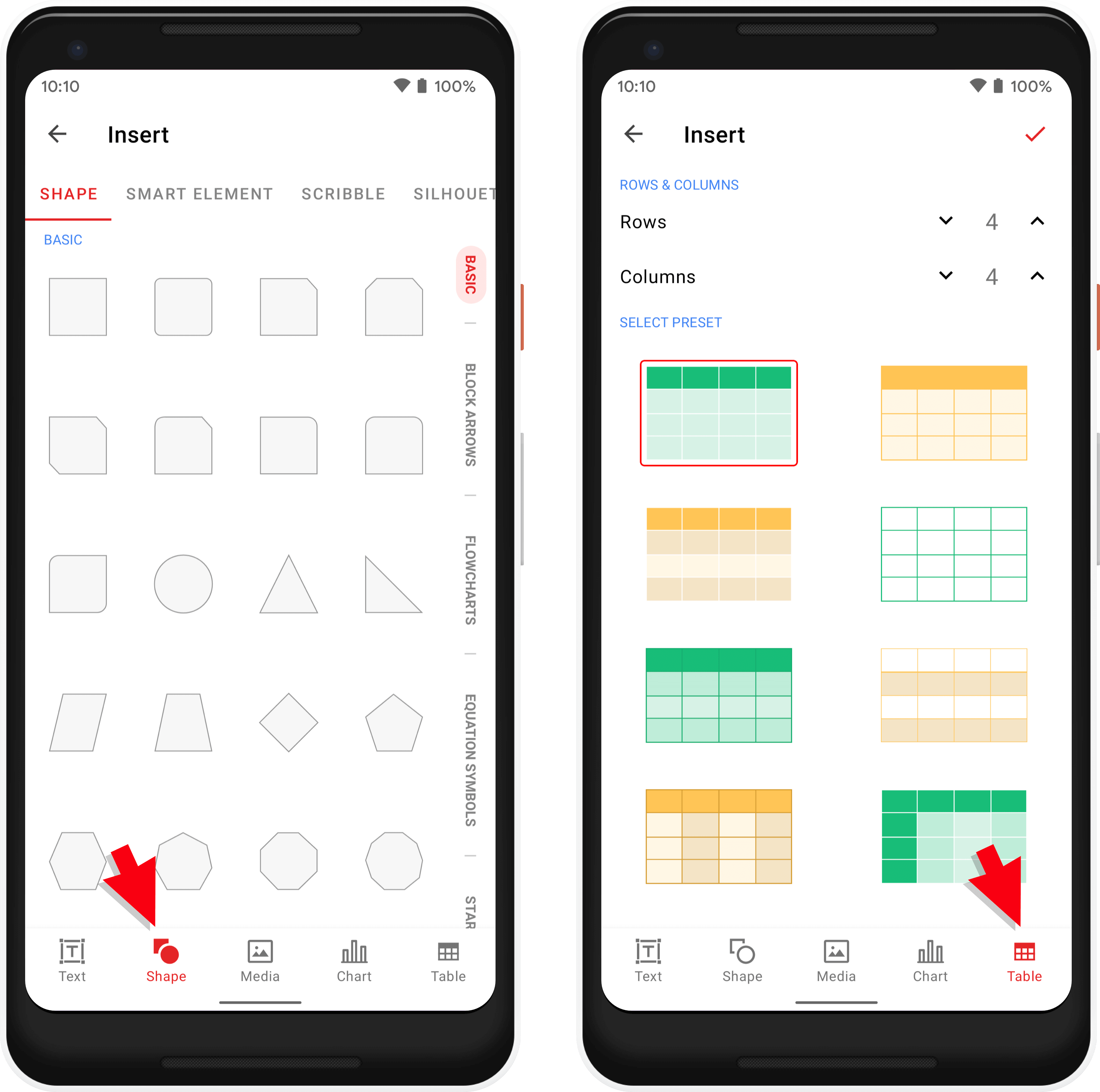 Tables help you to simplify and organize complex information. This will help your audience read it better. Tables are widely used to compare and categorize data. The Show app for Android offers various table presets for you to select from, based on your requirement.