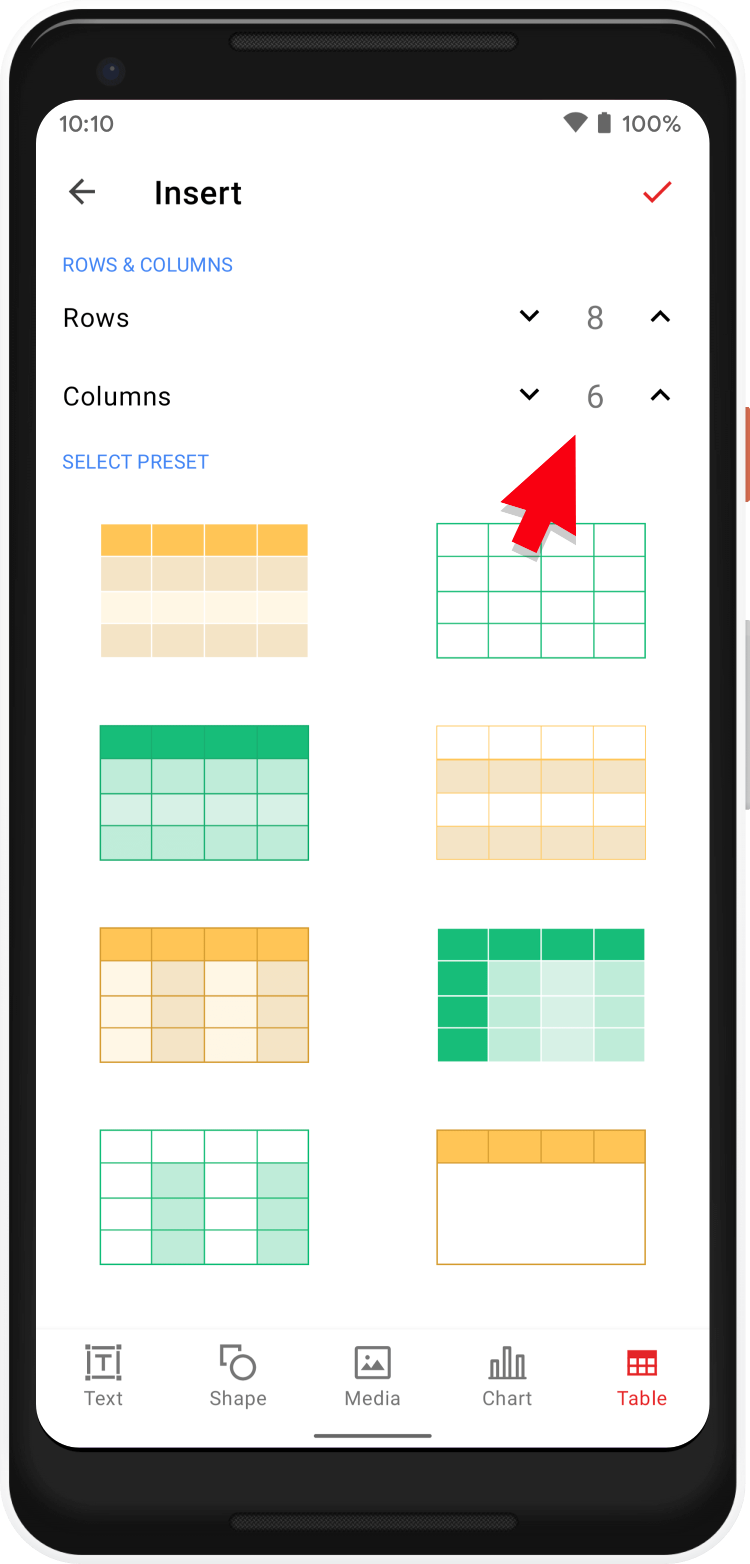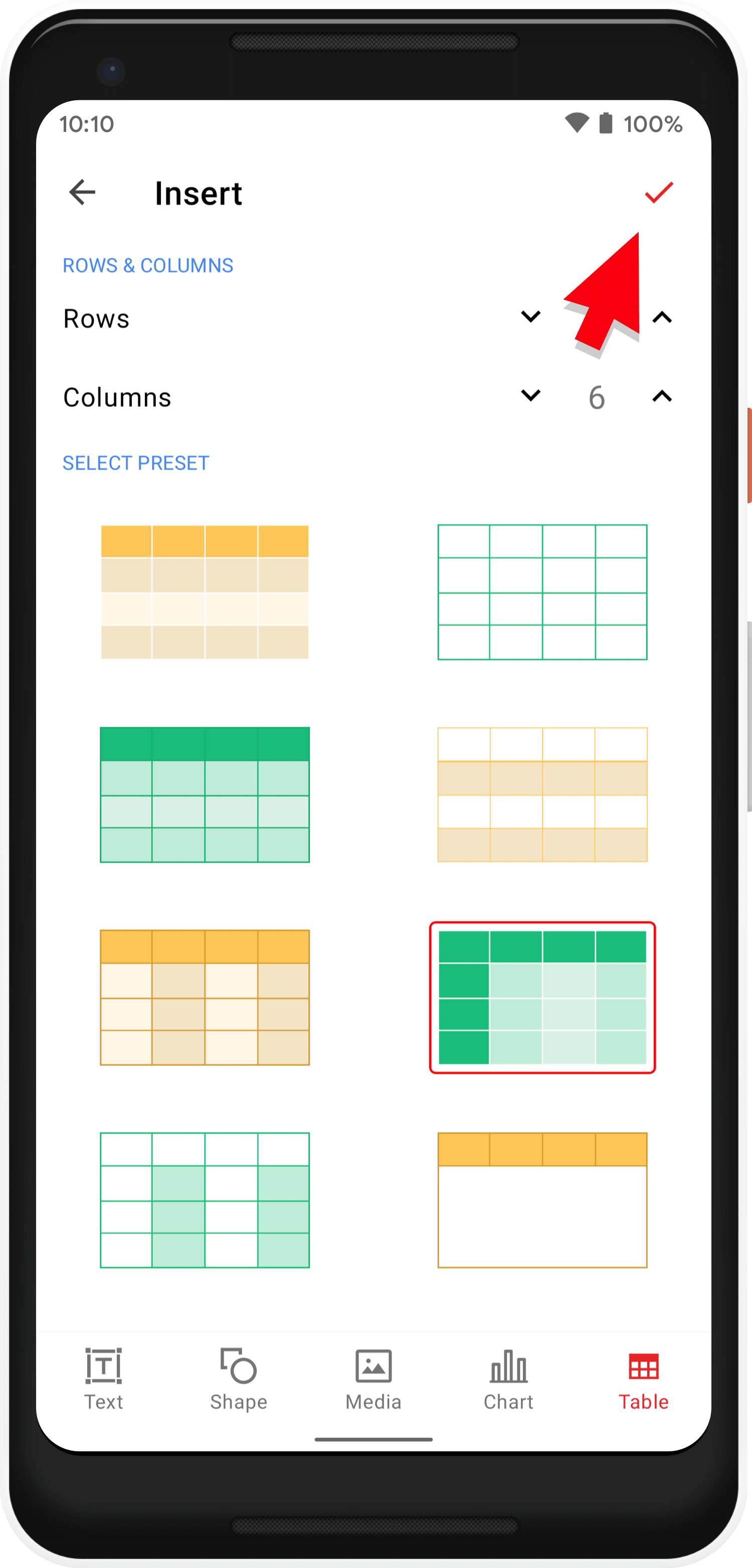 Tap the selected table preset and tap the check mark icon in the top-left corner.