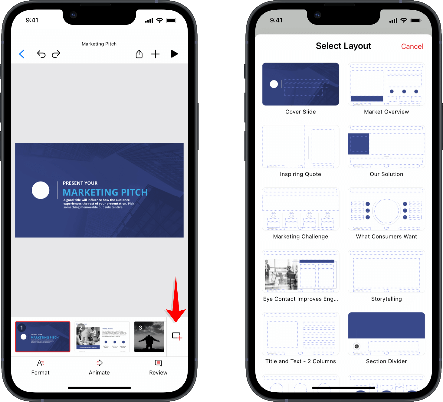 4. Select a slide, click the   button at the bottom-right corner and you can choose a layout from the existing template to be added as your next slide.