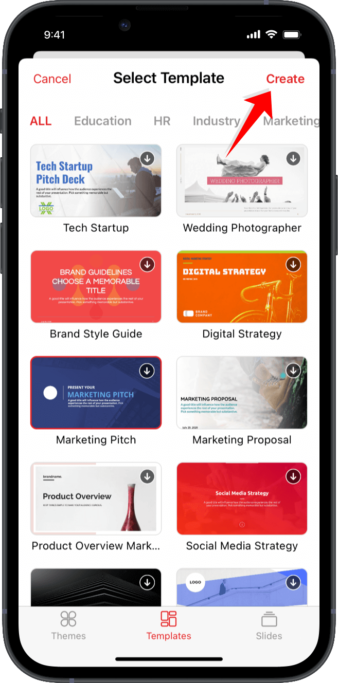 3. If you have signed in to the Show app, select the required template and tap Create on the top-right corner to start creating your presentation. You can preview the slides at the bottom thumbnail pane.