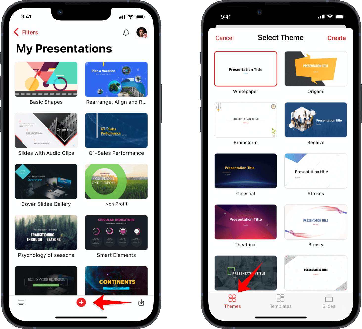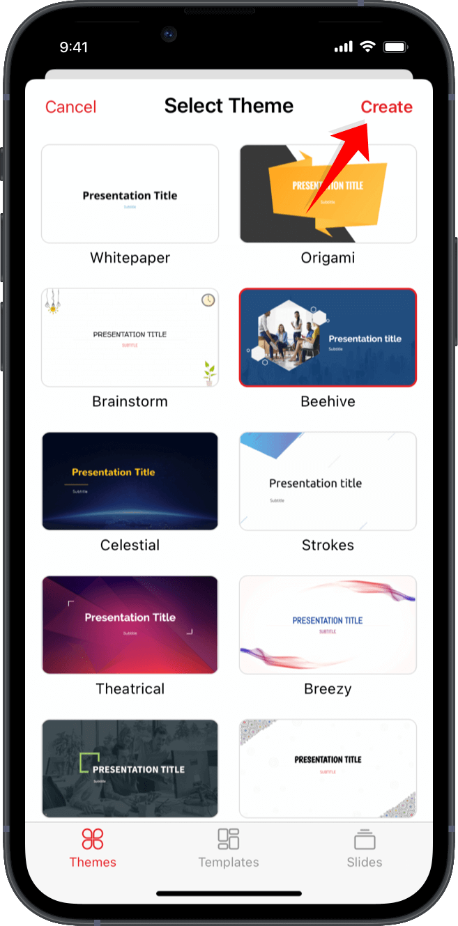 Pick an appropriate design from the Themes tab, then tap the Create button at the top-right corner to open the presentation.