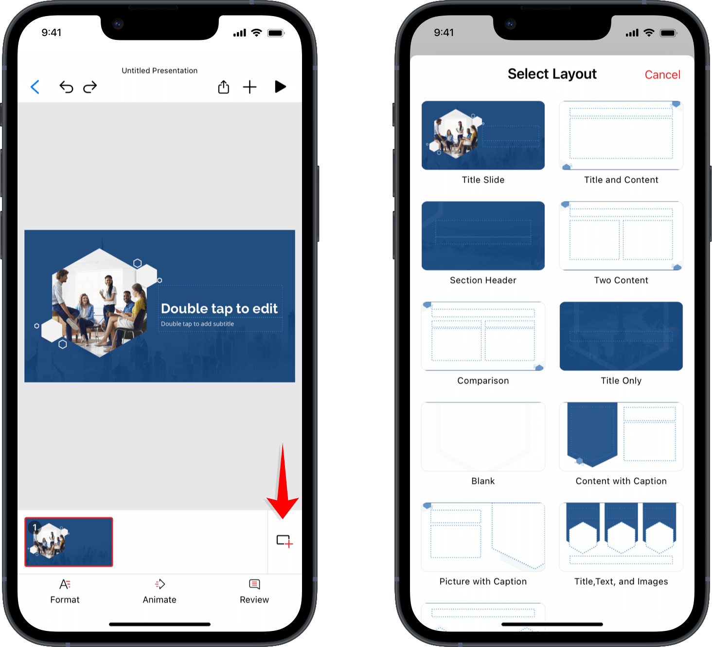 Tap the icon at the bottom-right corner to add more slides with your preferred layouts. You can also preview your slides at the bottom as thumbnails.