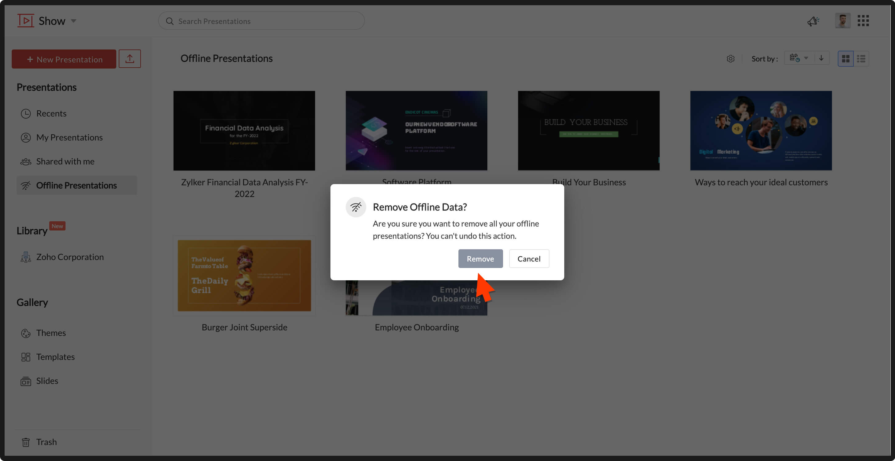 Removing offline data will remove all the presentations and gallery items (slides, themes, and templates) saved offline.