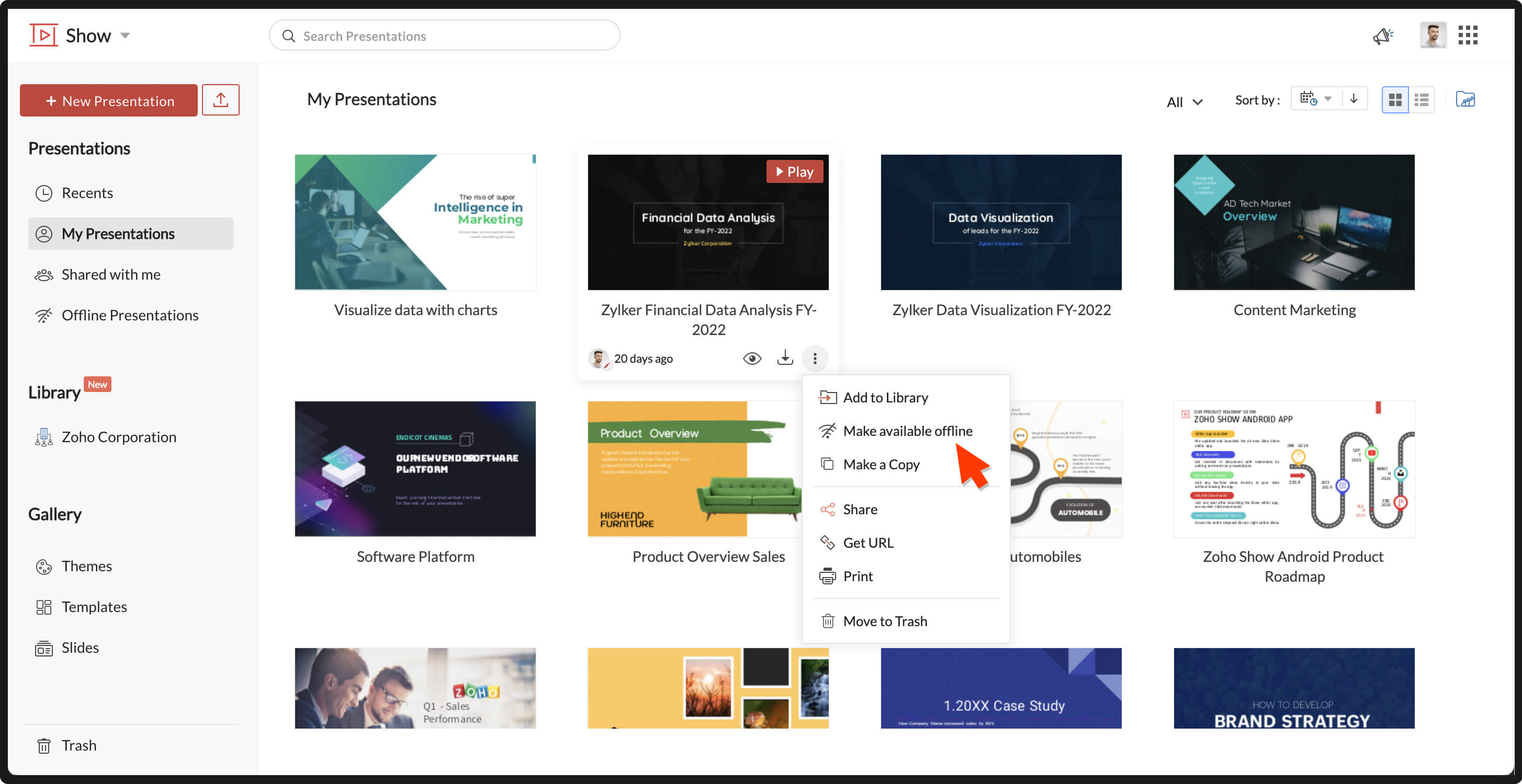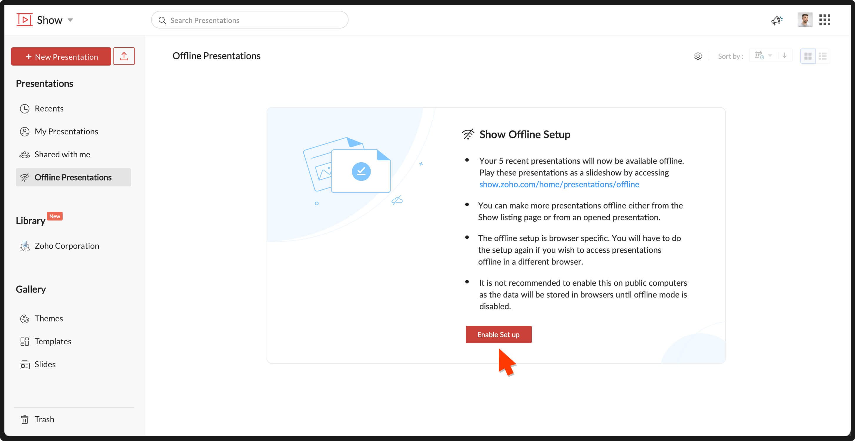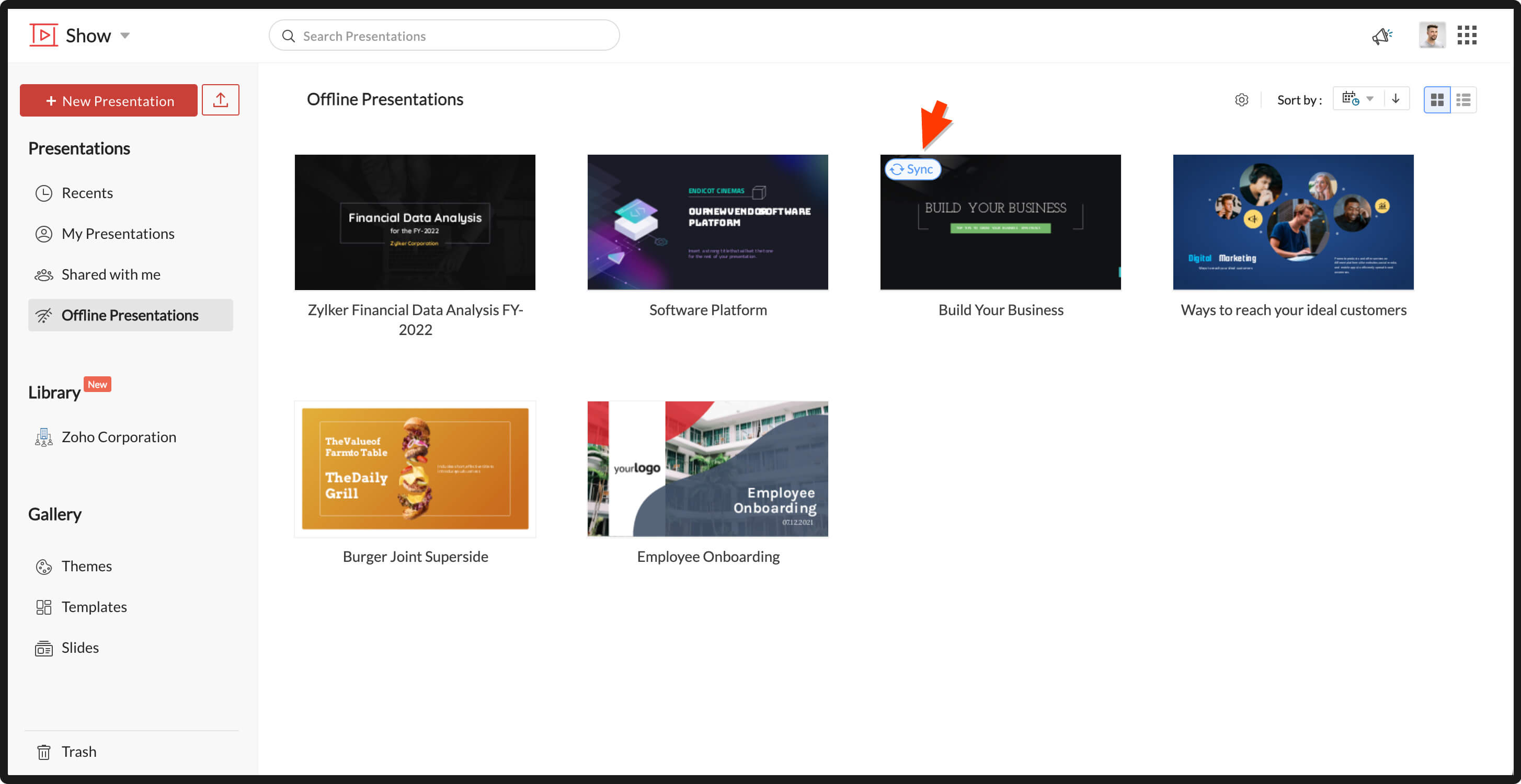 While working on a presentation, when you are connected to the internet, you will be notified to sync your offline presentations online.