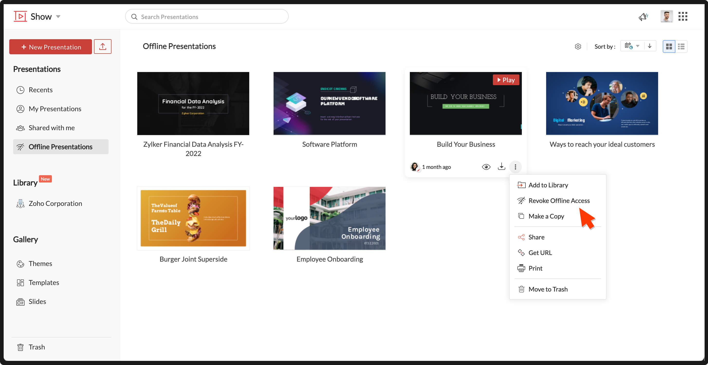 on the presentation that you have given offline access to and select Revoke Offline Access. - In the editor page, click File and choose Revoke Offline Access.