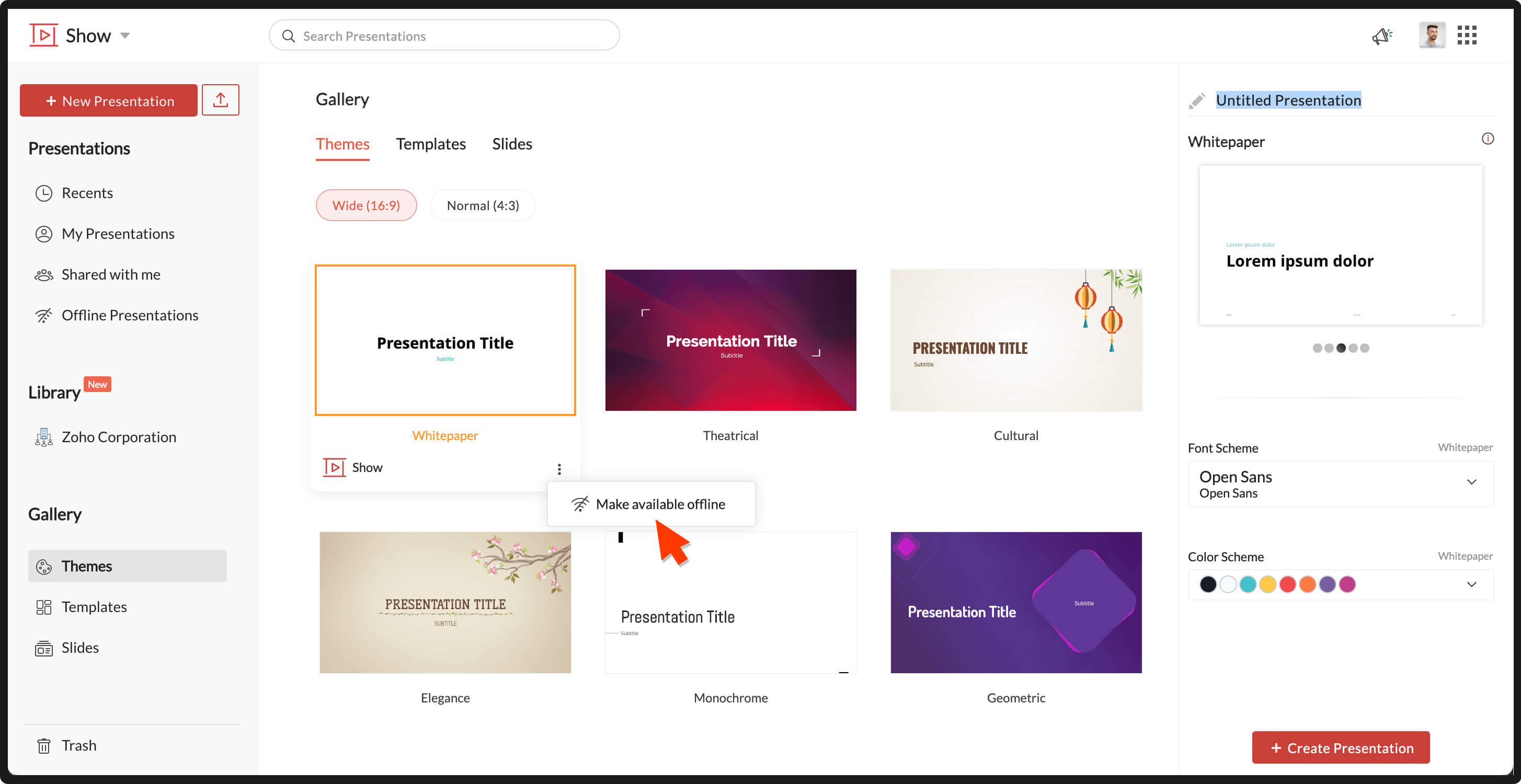 You can create a presentation offline using the downloaded templates, themes, and slide designs.