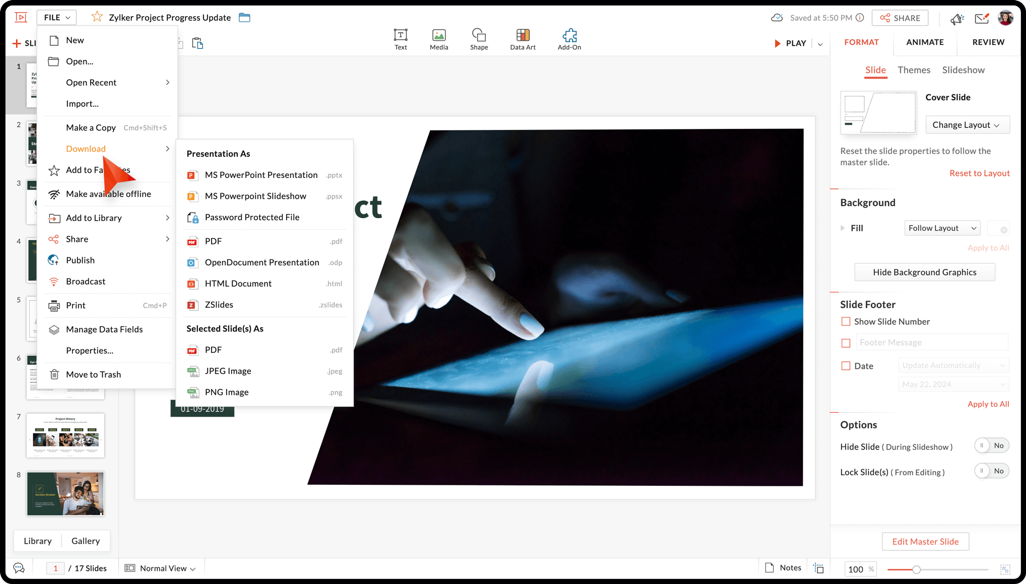 How to import and export or download presentations into Zoho Show