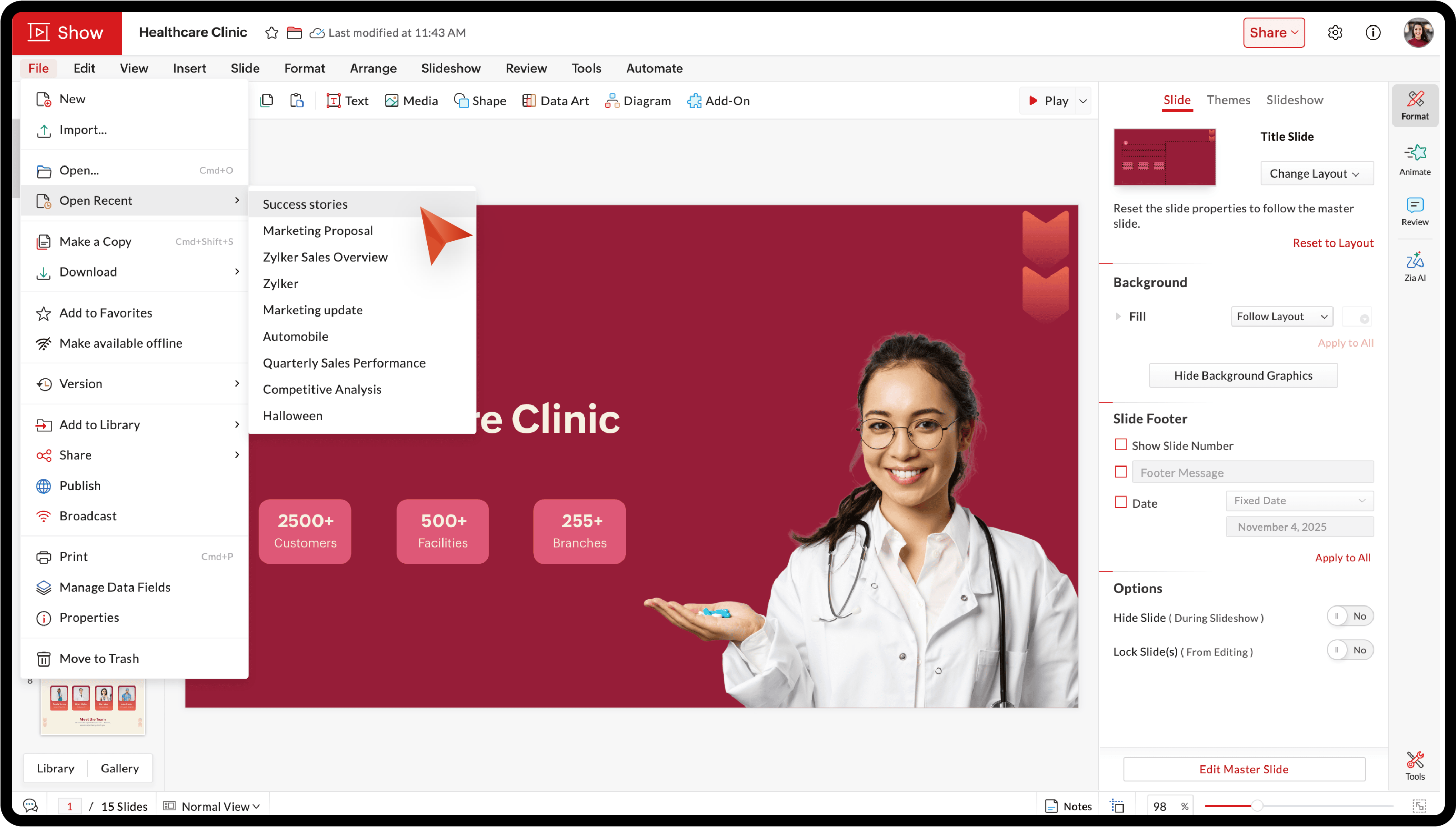 Zoho Show lets you to access a presentation that already exists in your Zoho WorkDrive or Desktop folder. All your Zoho Show presentations will be saved on our local server automatically, so you don't have to make a backup or save the slide deck every time you make changes.