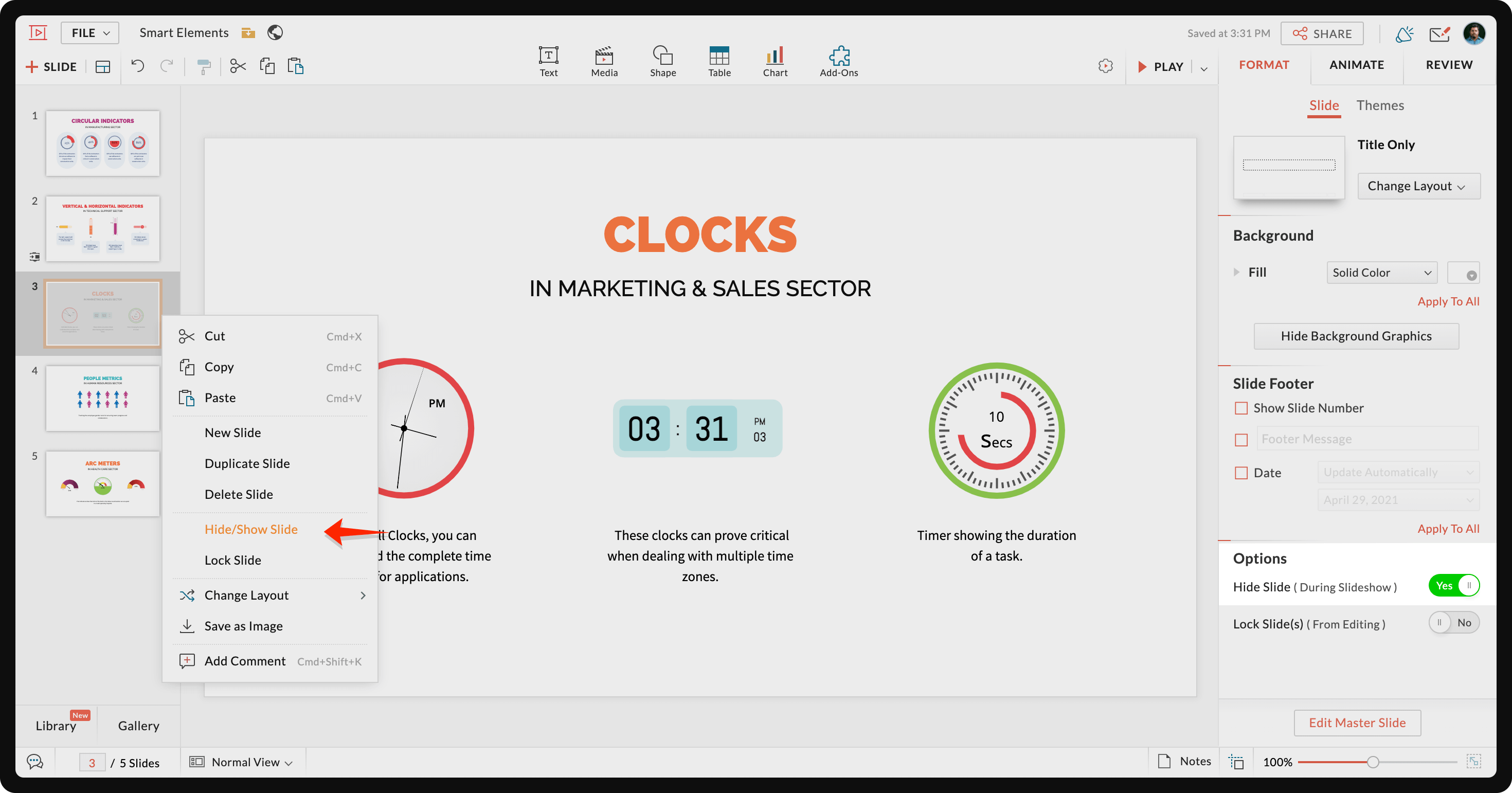 • Click the Format mode on the right pane, choose Slide tab, and enable the Hide Slide button at the bottom of the pane.