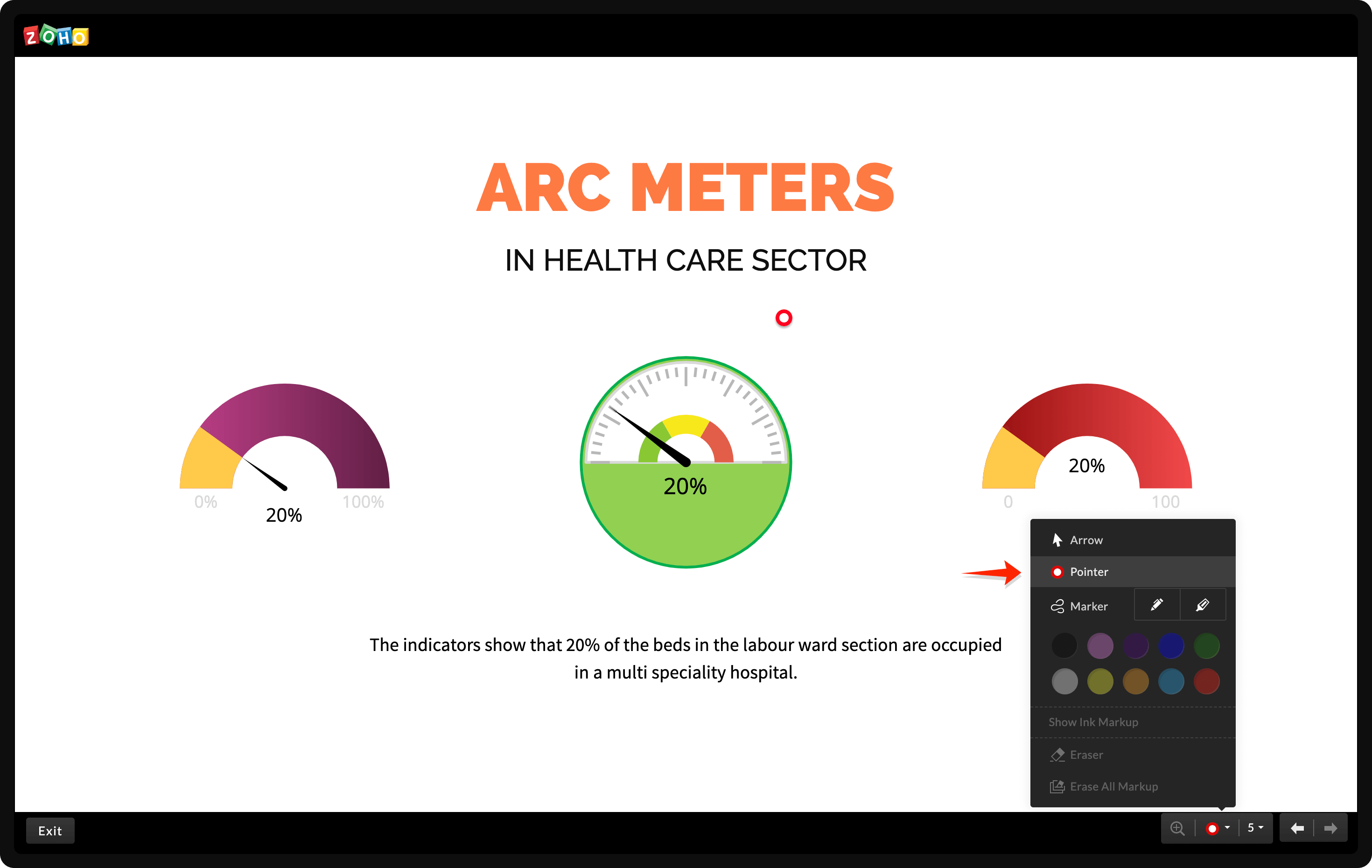 Change your mouse arrow into a pointer to emphasize a point or show connections. Like a highlighter pen, it does not cover the slide content. There are two types of highlighter tools: Arrow and Laser Pointer.
