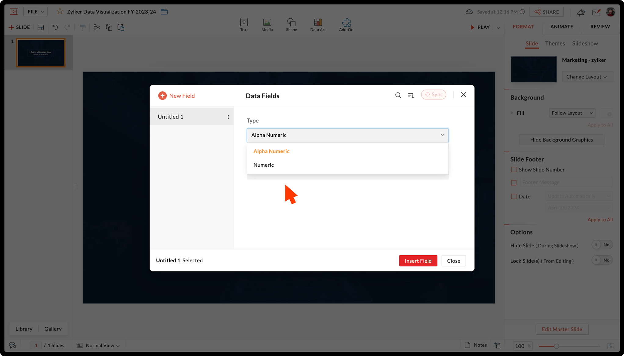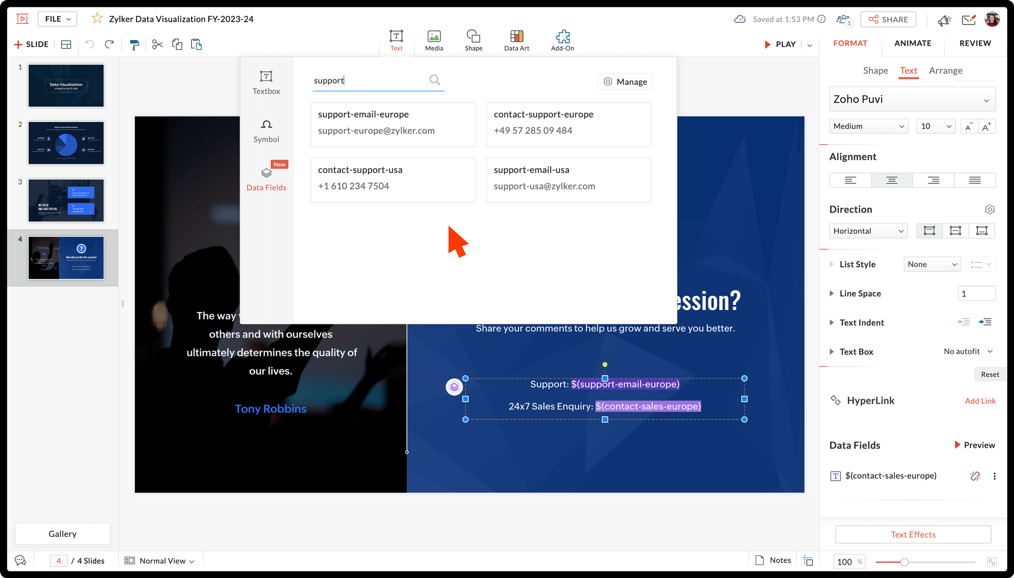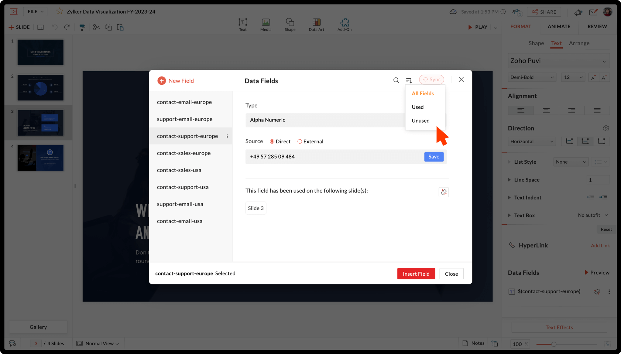 To use the added data field in other slides, navigate to the required slide, enter the $ symbol, then choose the data field that you wish to insert from the dropdown.