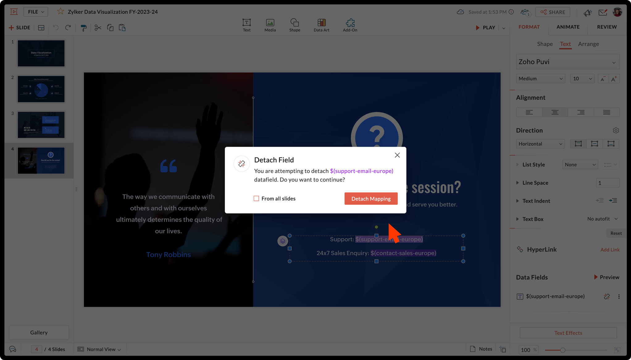 Check From all slides box if you'd like to detach data field from all the slides in the presentation.