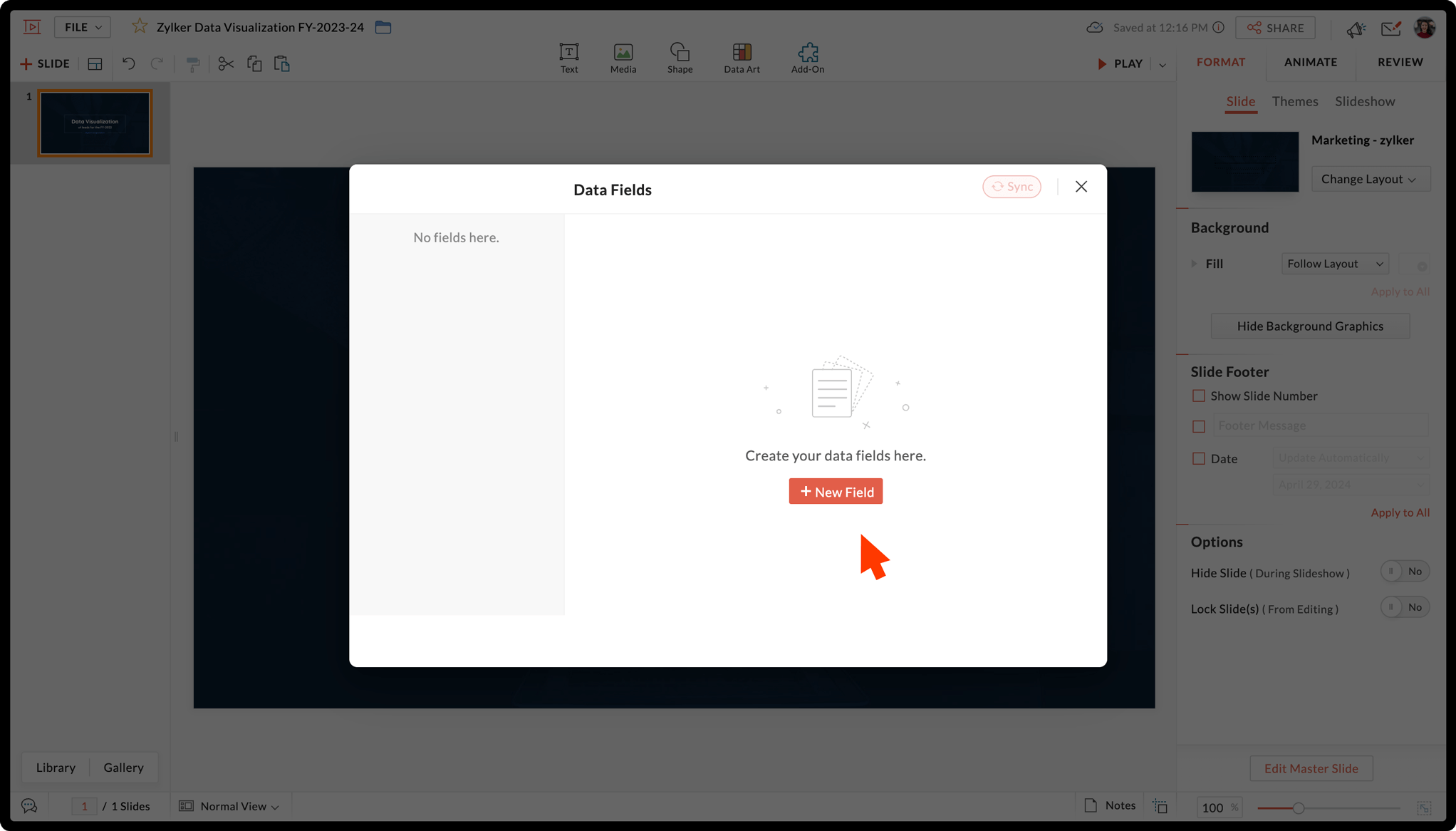 You can also enter $ in the required slide and choose Create New to create a new data field.