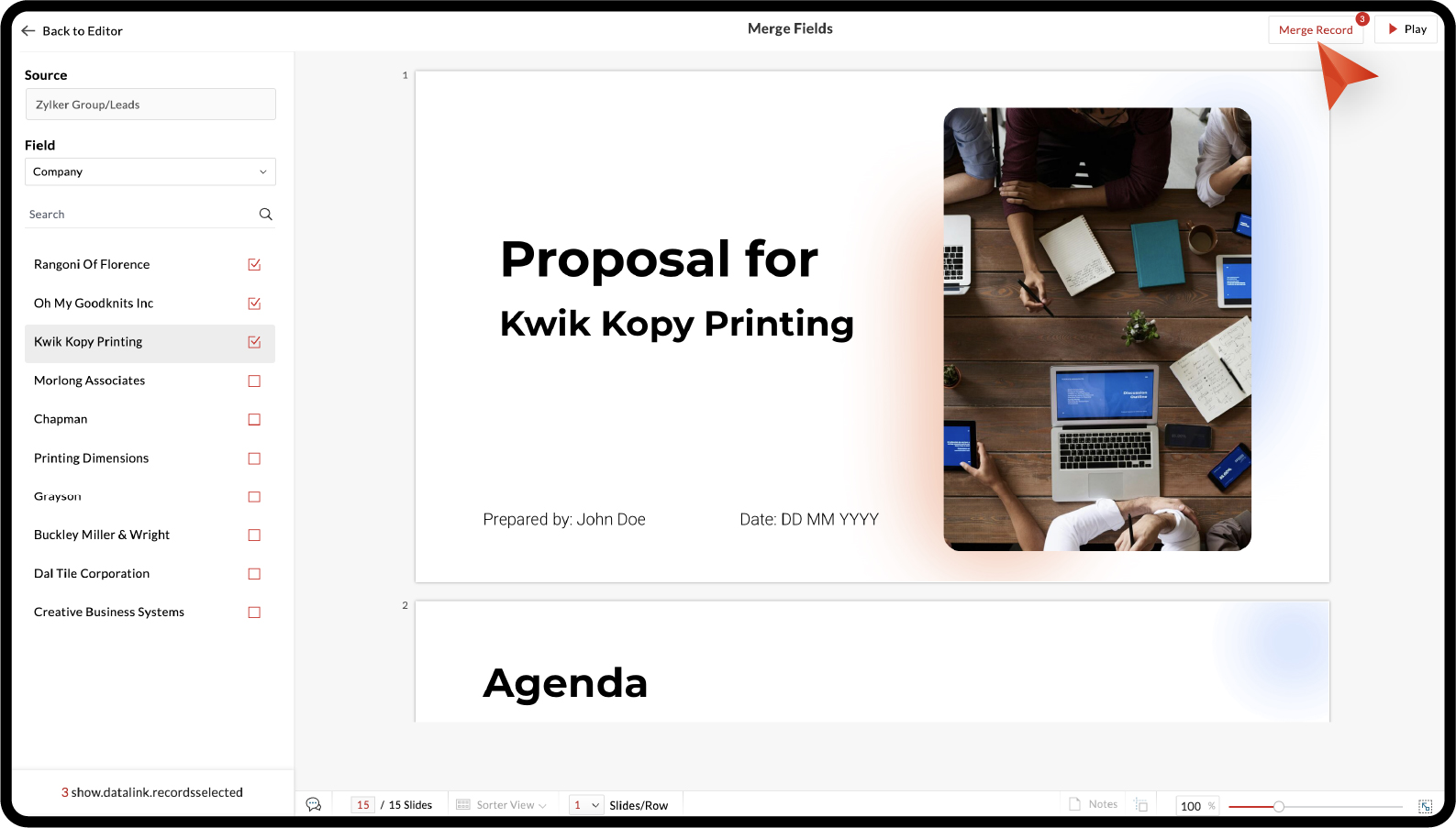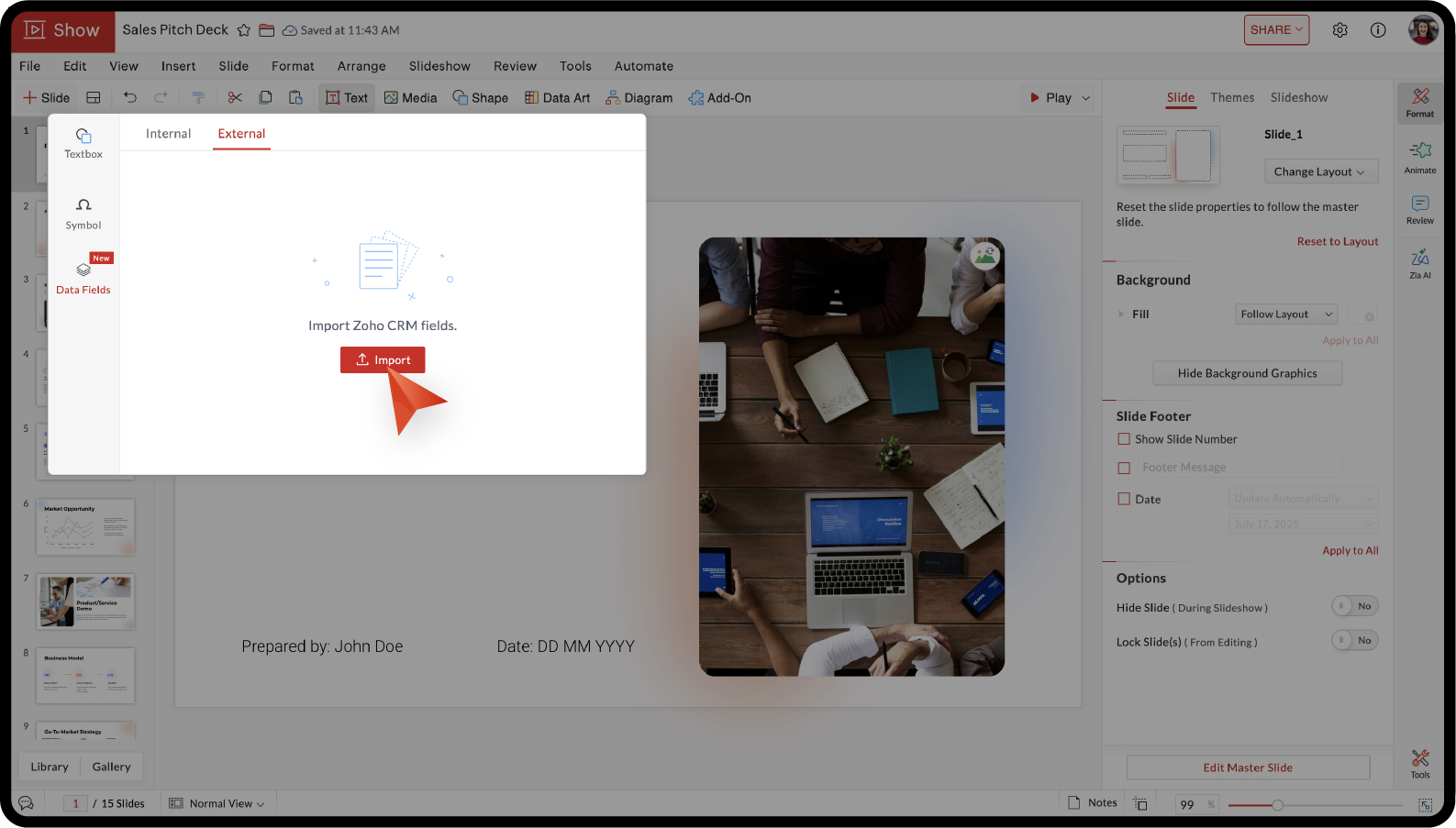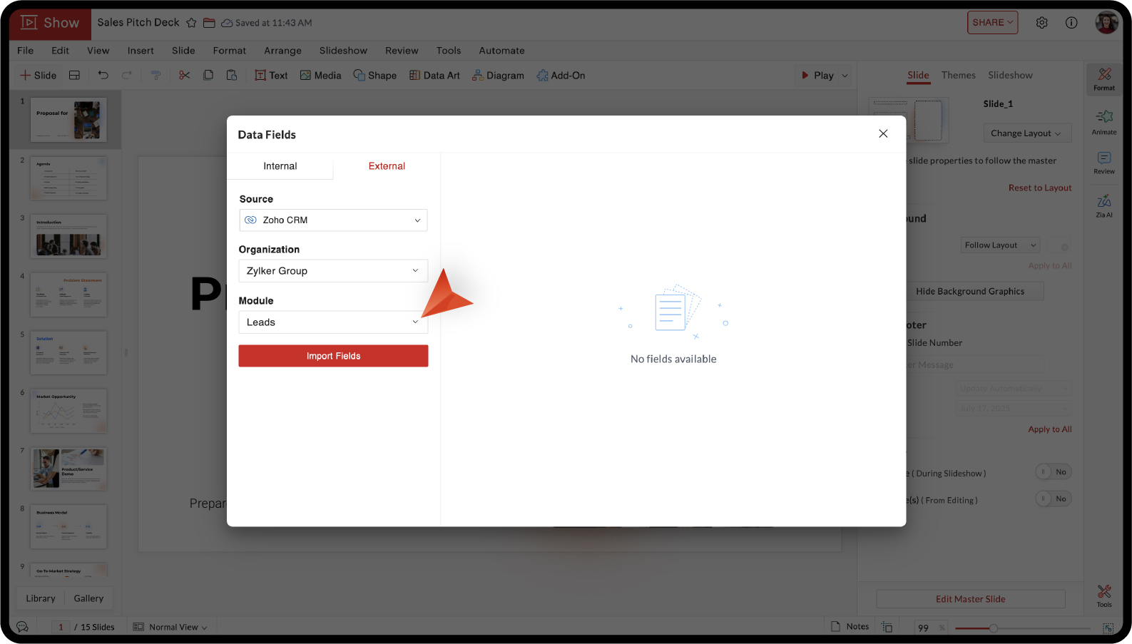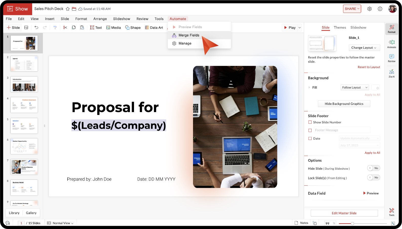 For example, a sales team can store client details like company name, industry, and team size in Zoho CRM. Instead of updating these details manually for each sales pitch deck, you can import them as data fields and merge them into your slides. This makes it easy to create personalized presentations for multiple clients while keeping your information accurate.